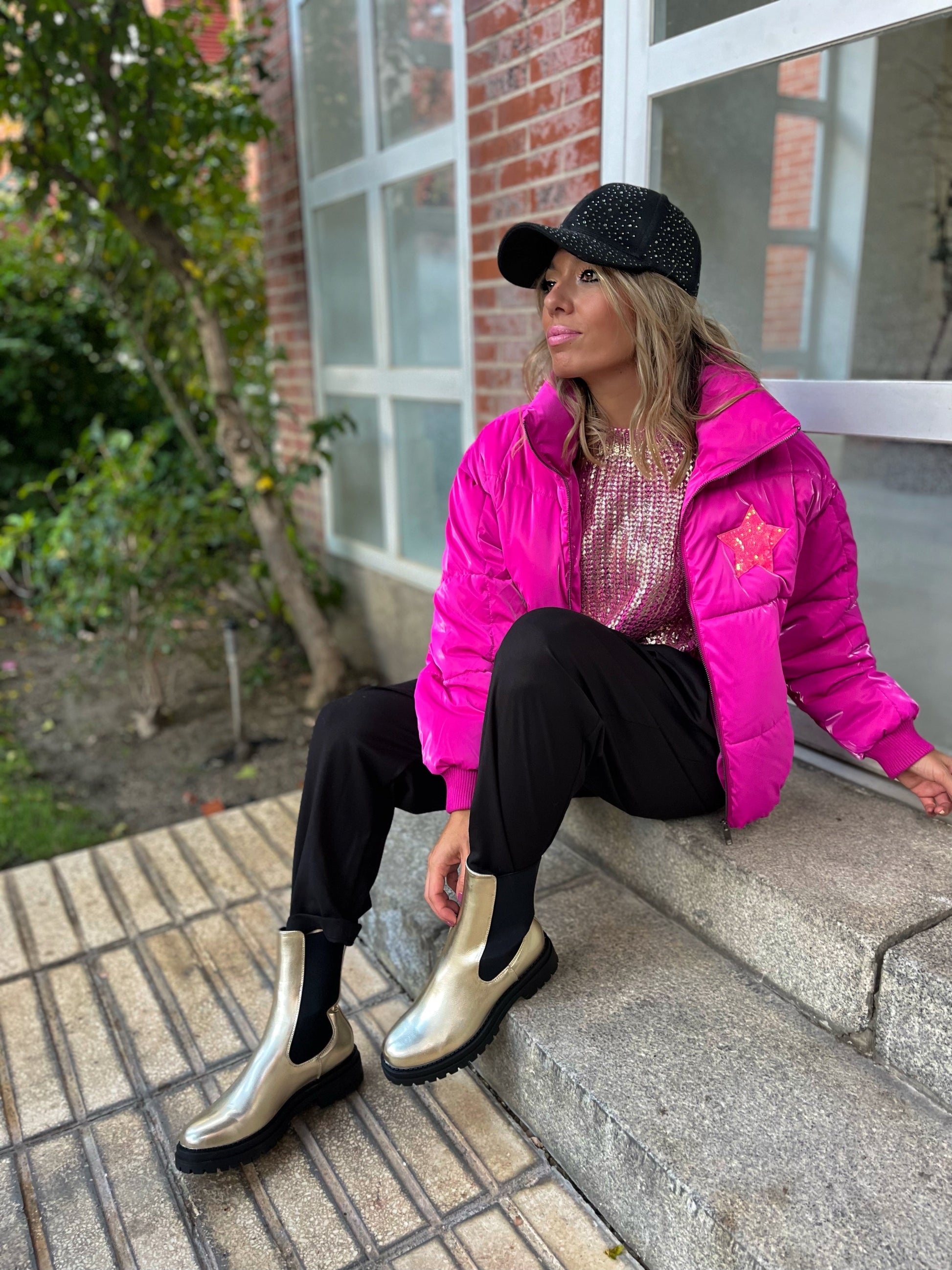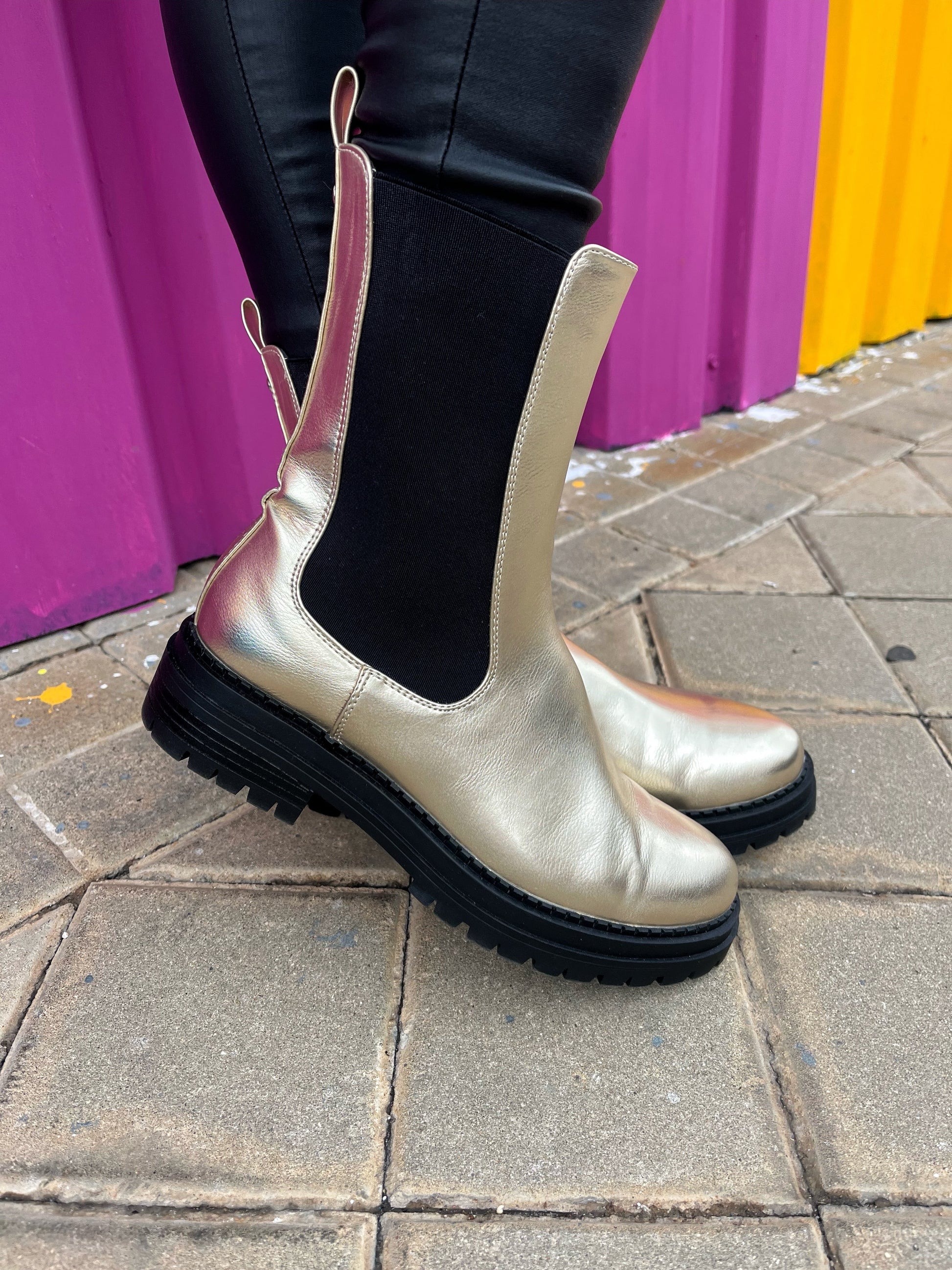 Botas track en color doradas con detalles de gomas laterales y suela en color negro. Son súper cómodas y no pesan mucho. Tienen un color dorado muy sutil y discreto. Tallan normal.