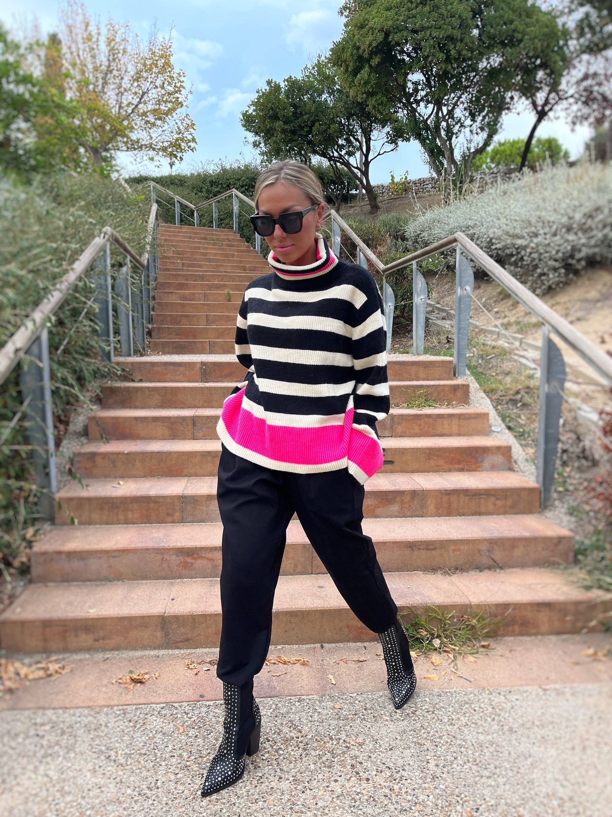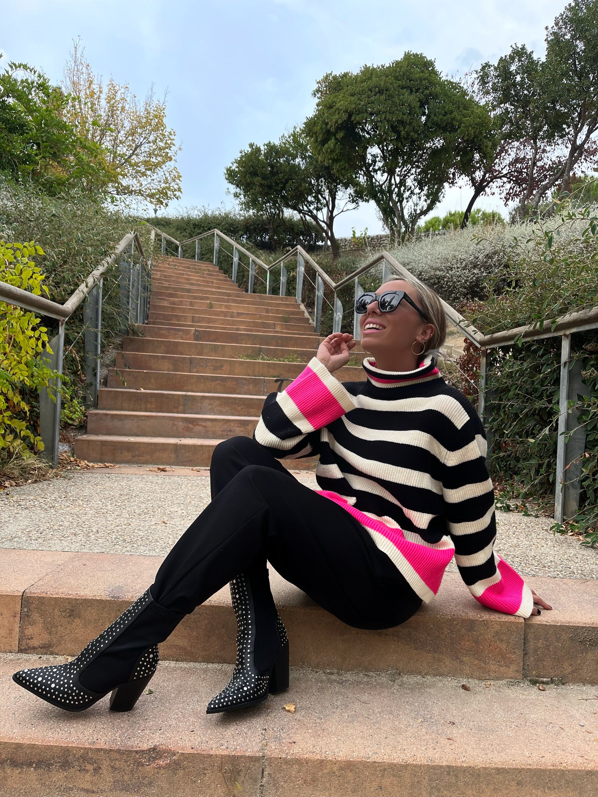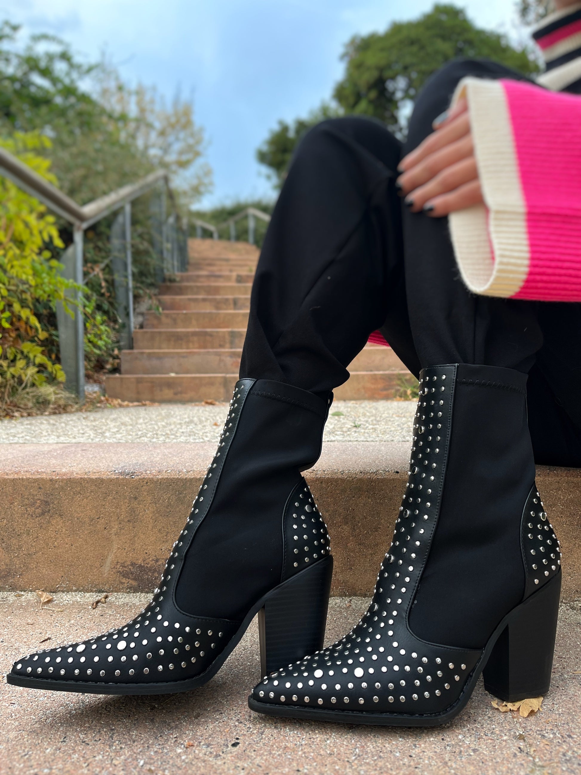 Botín negro con tachas plateadas en parte delantera y parte de la caña frontal y parte trasera encima del tacón. Laterales de lycra. Súper cómodos ( talla pequeño) Altura tacón : 11CM