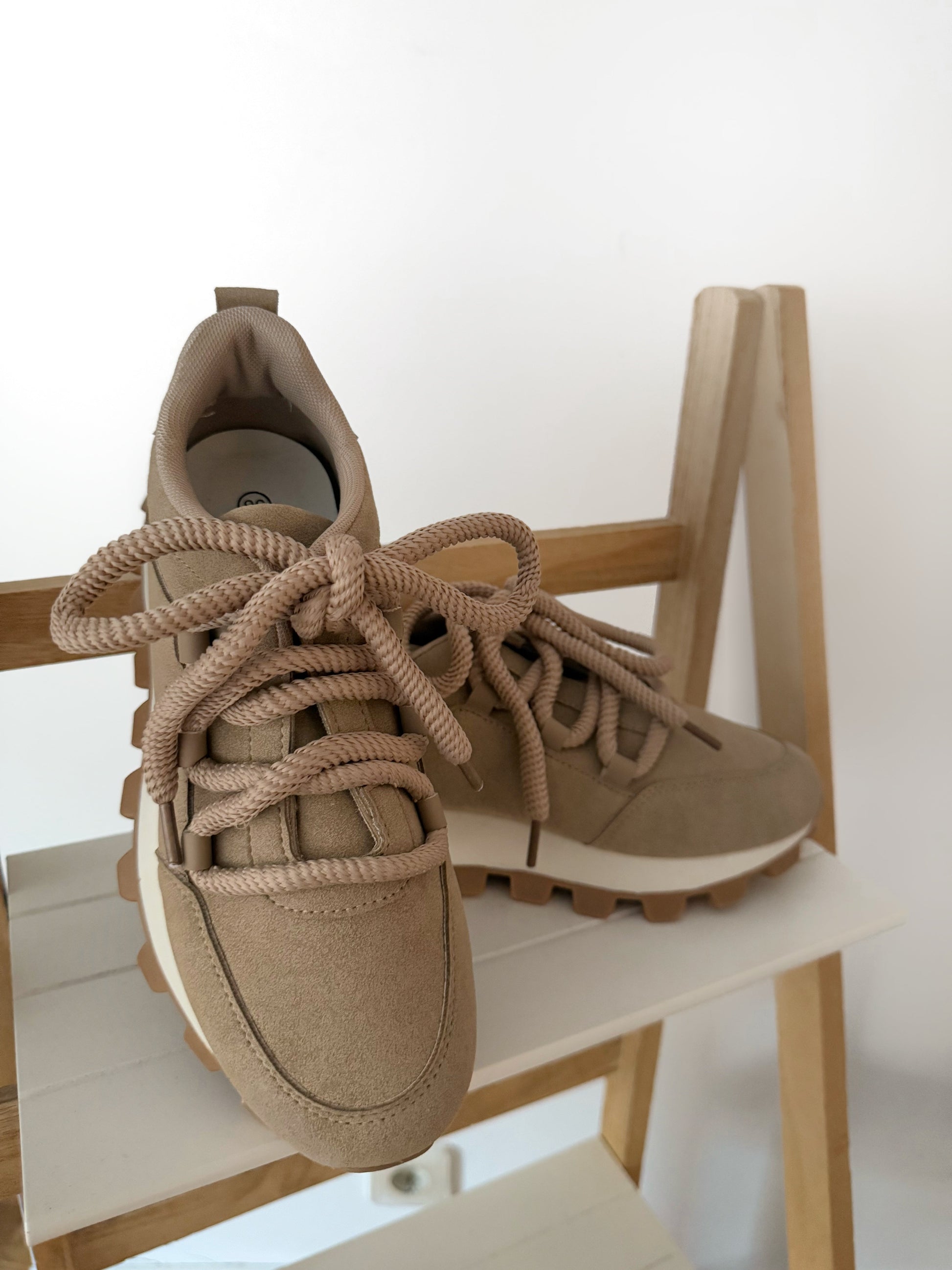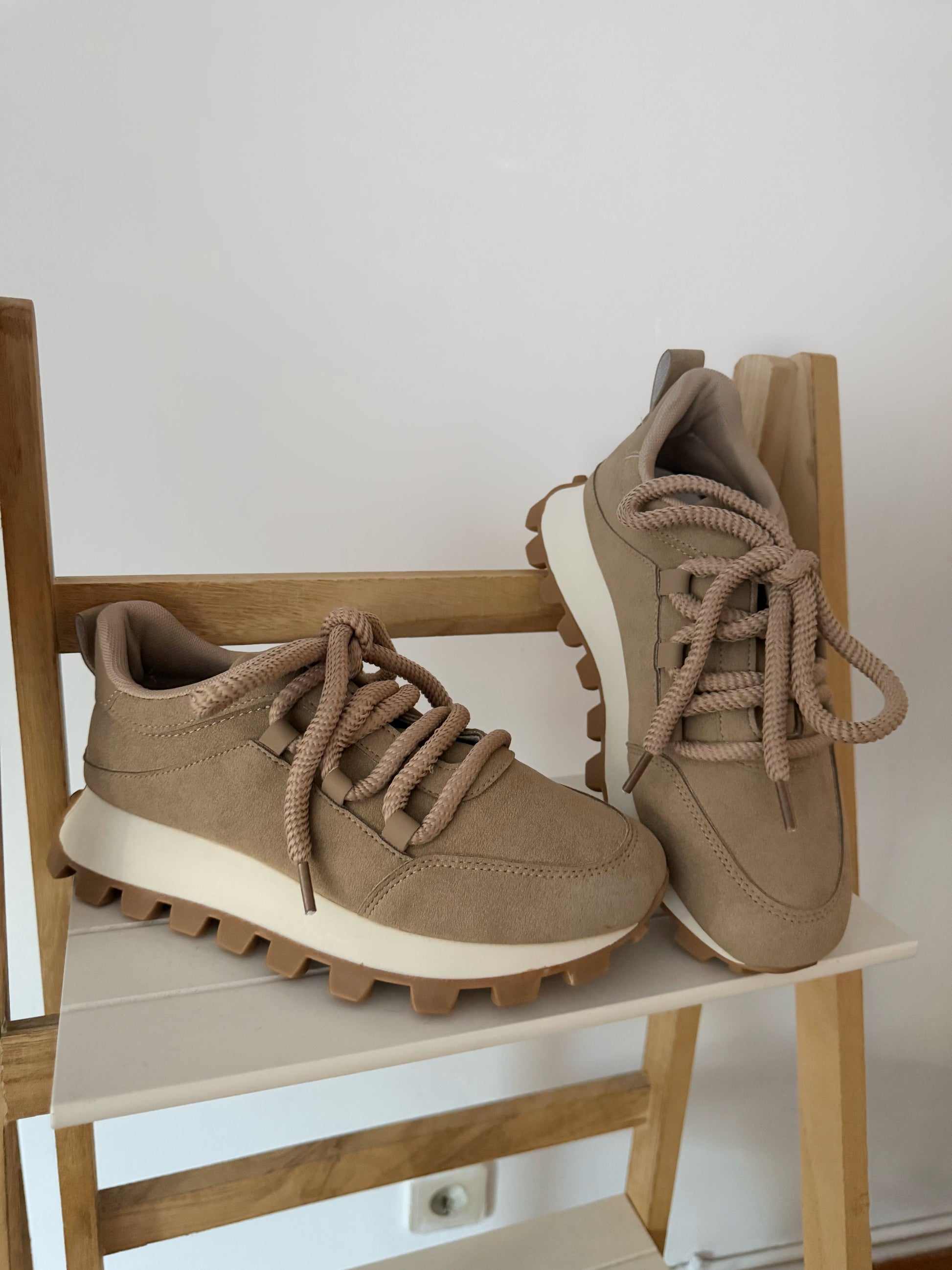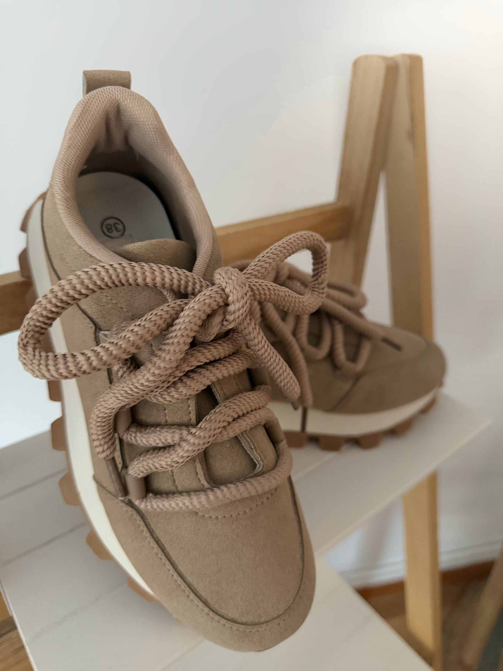 Deportiva de antelina en color camel con cordones satinados en color camel. Tiene plataforma en color crudo y suela tipo track. No pesa nada, es ligera y tiene una horma súper cómoda. Talla justo con el número.