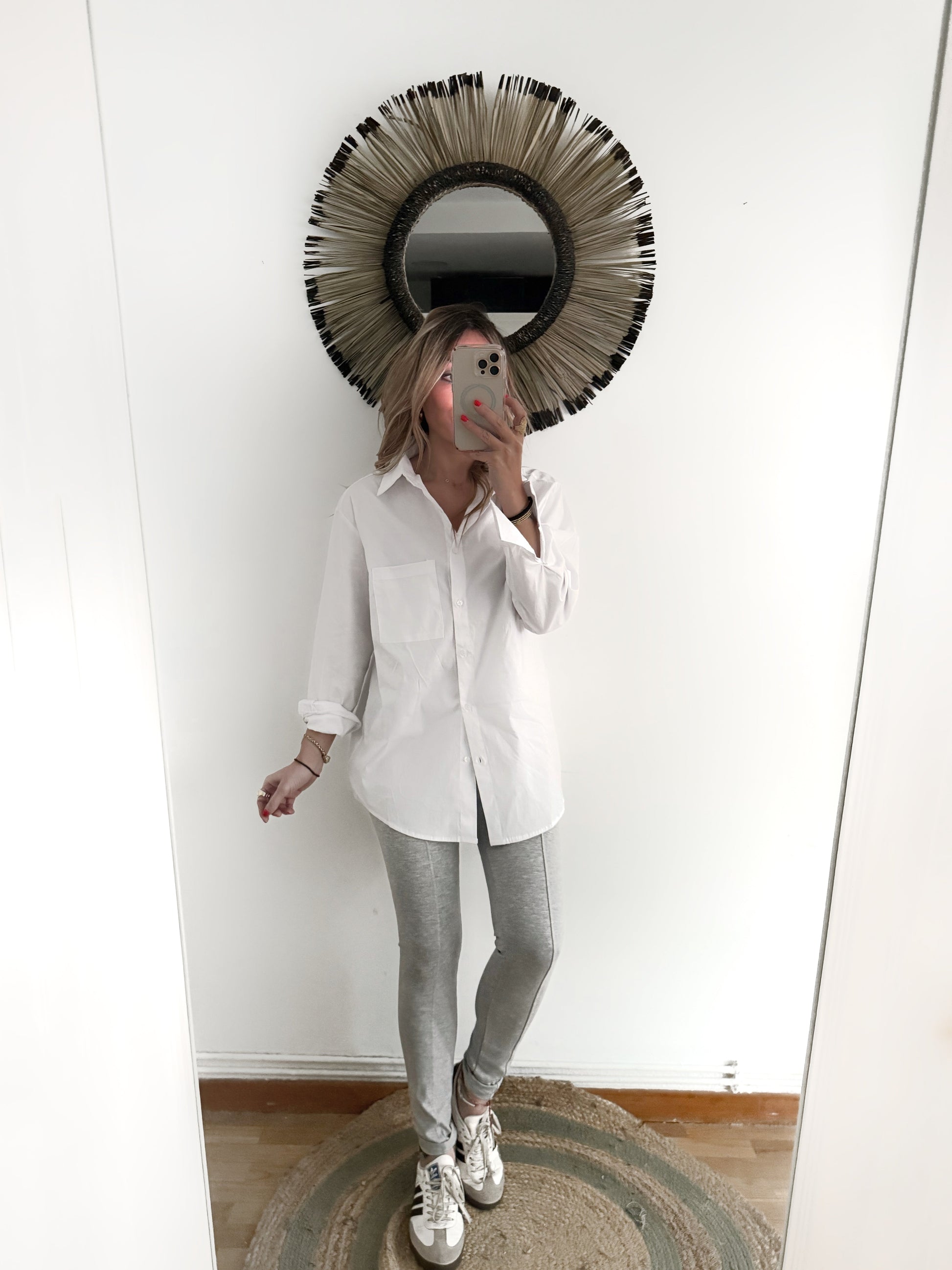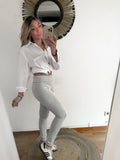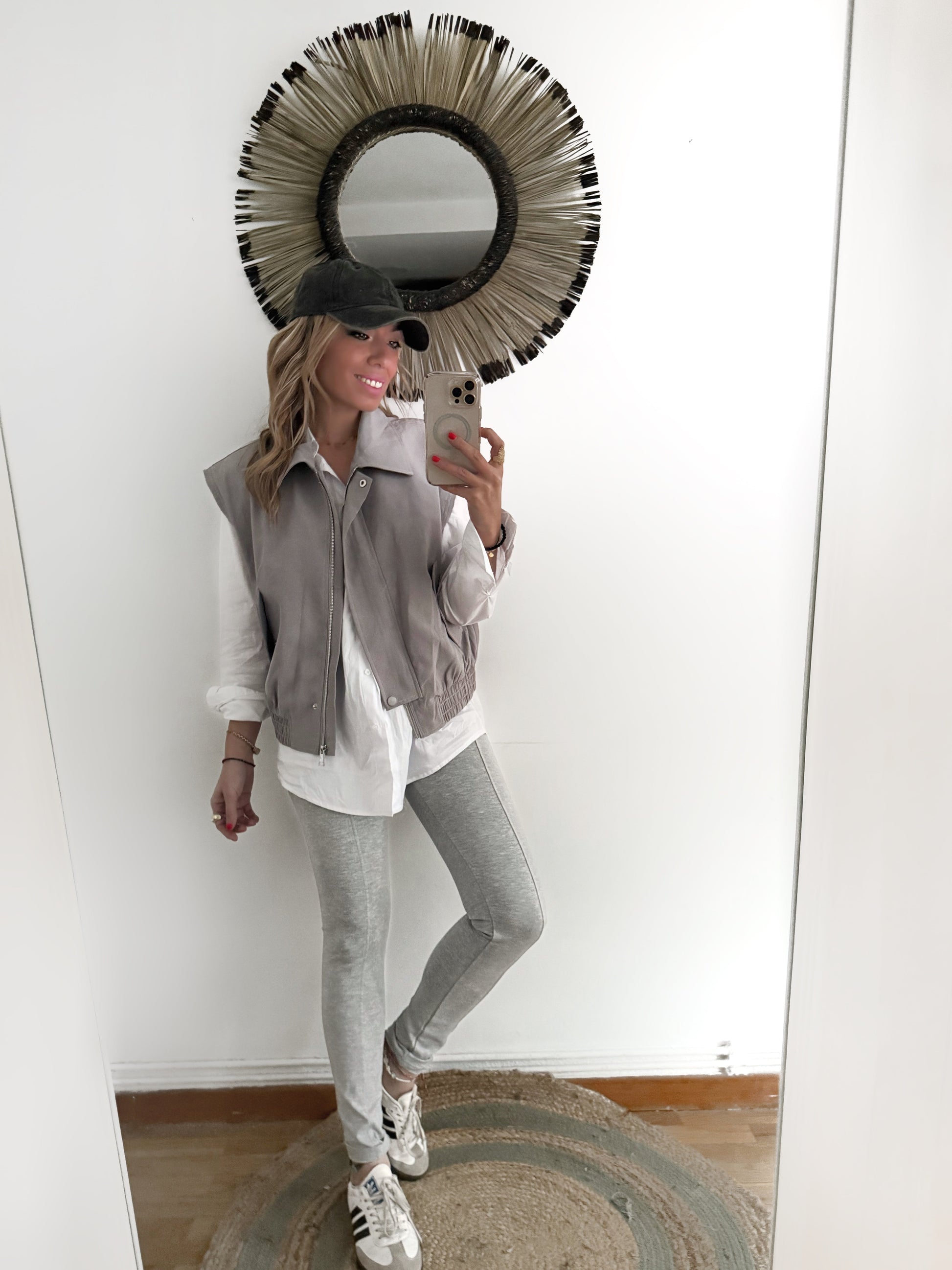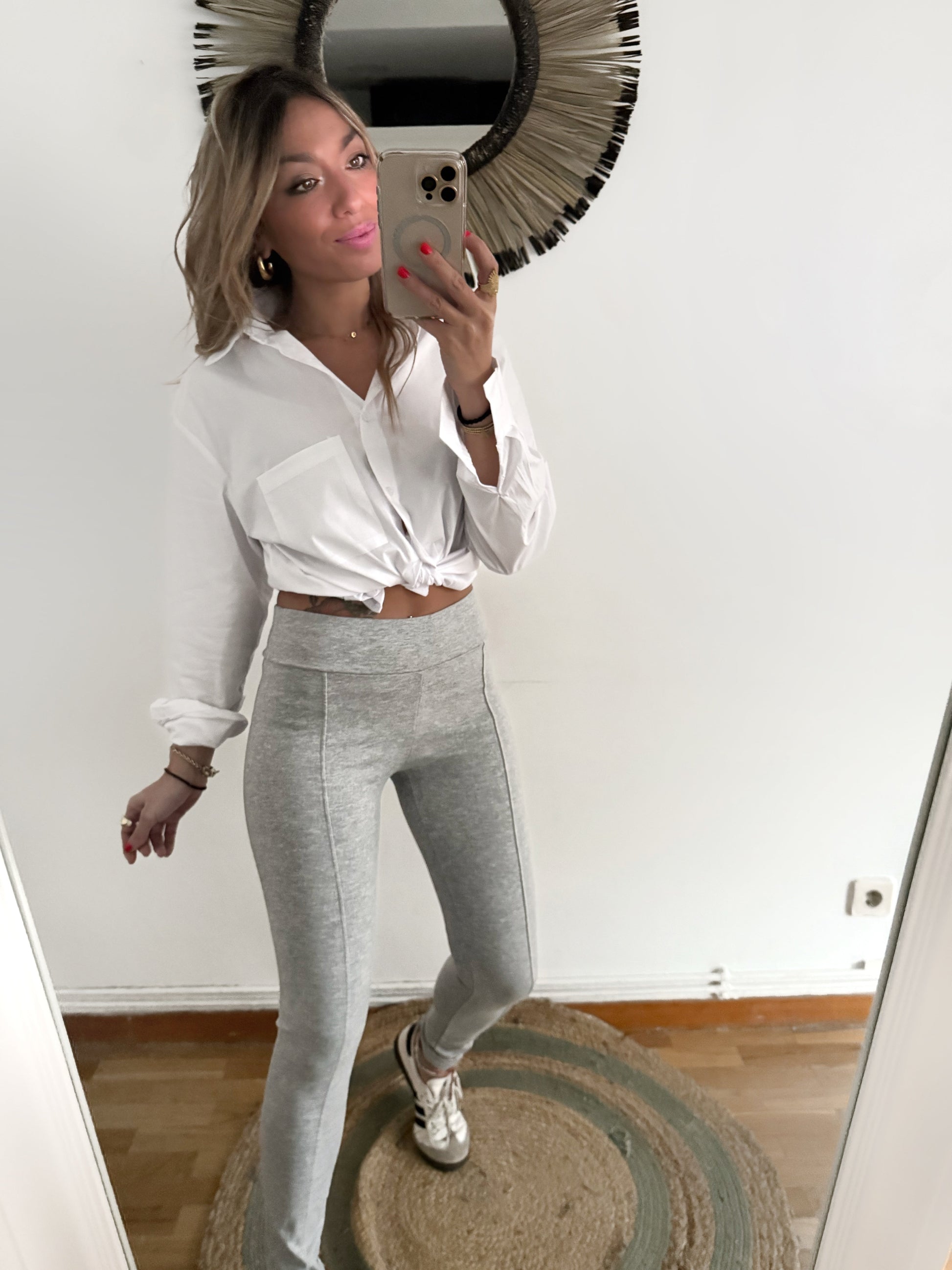 Leggins de algodón en color gris clarito jaspeado. Lleva goma en la cintura, es de tiro medio y pitillo. Tiene cintura ancha con goma. Lleva costuras en relieve en parte delantera y trasera. Se adapta genial.