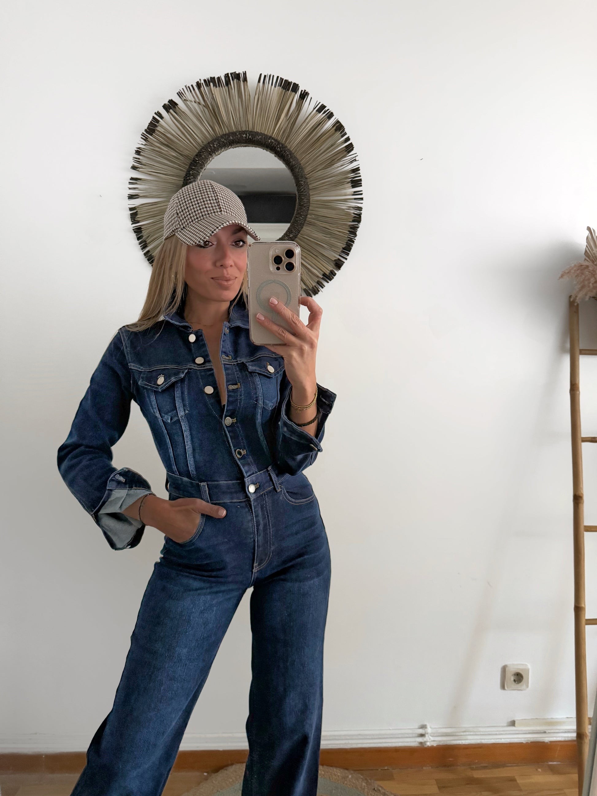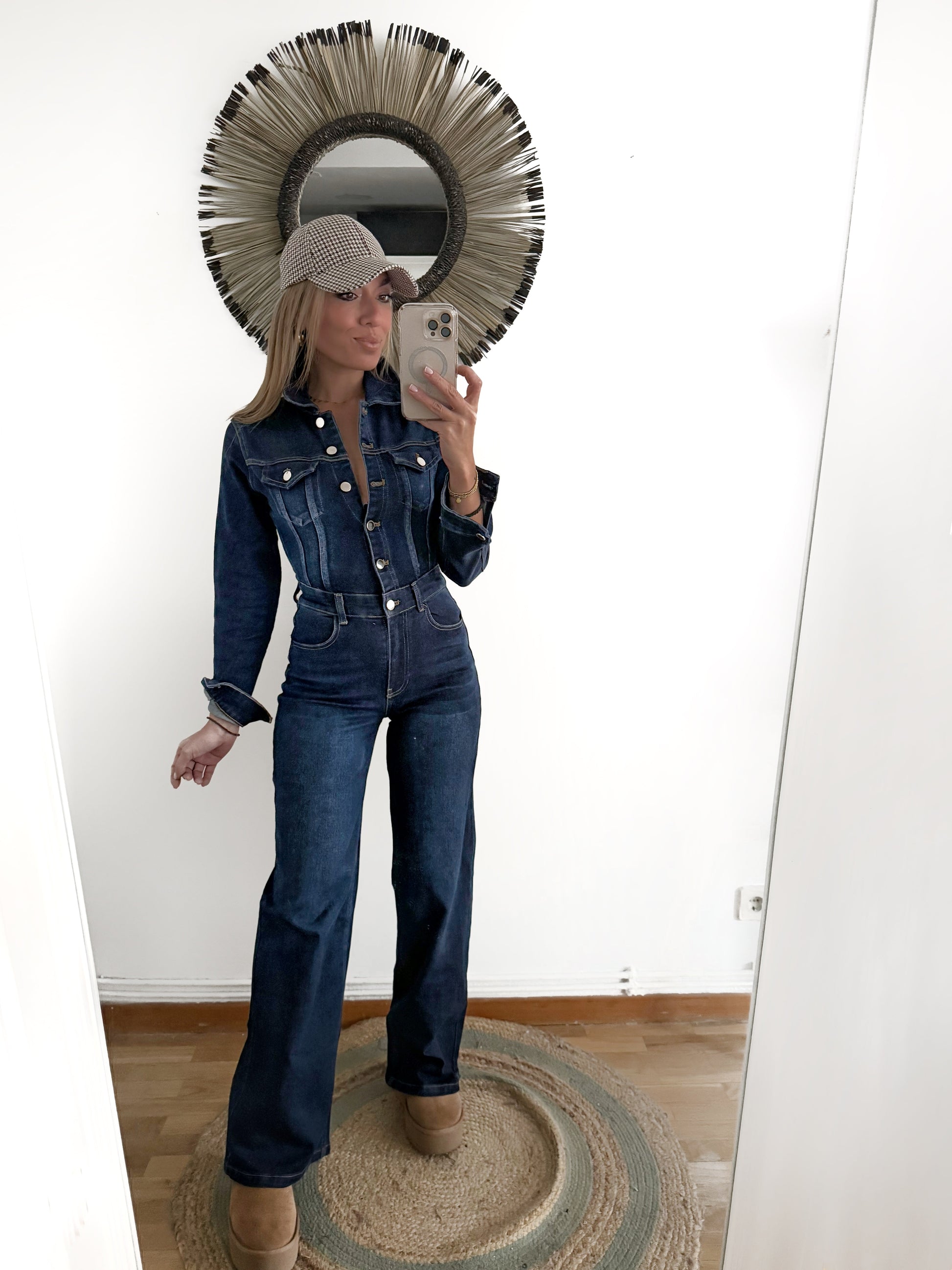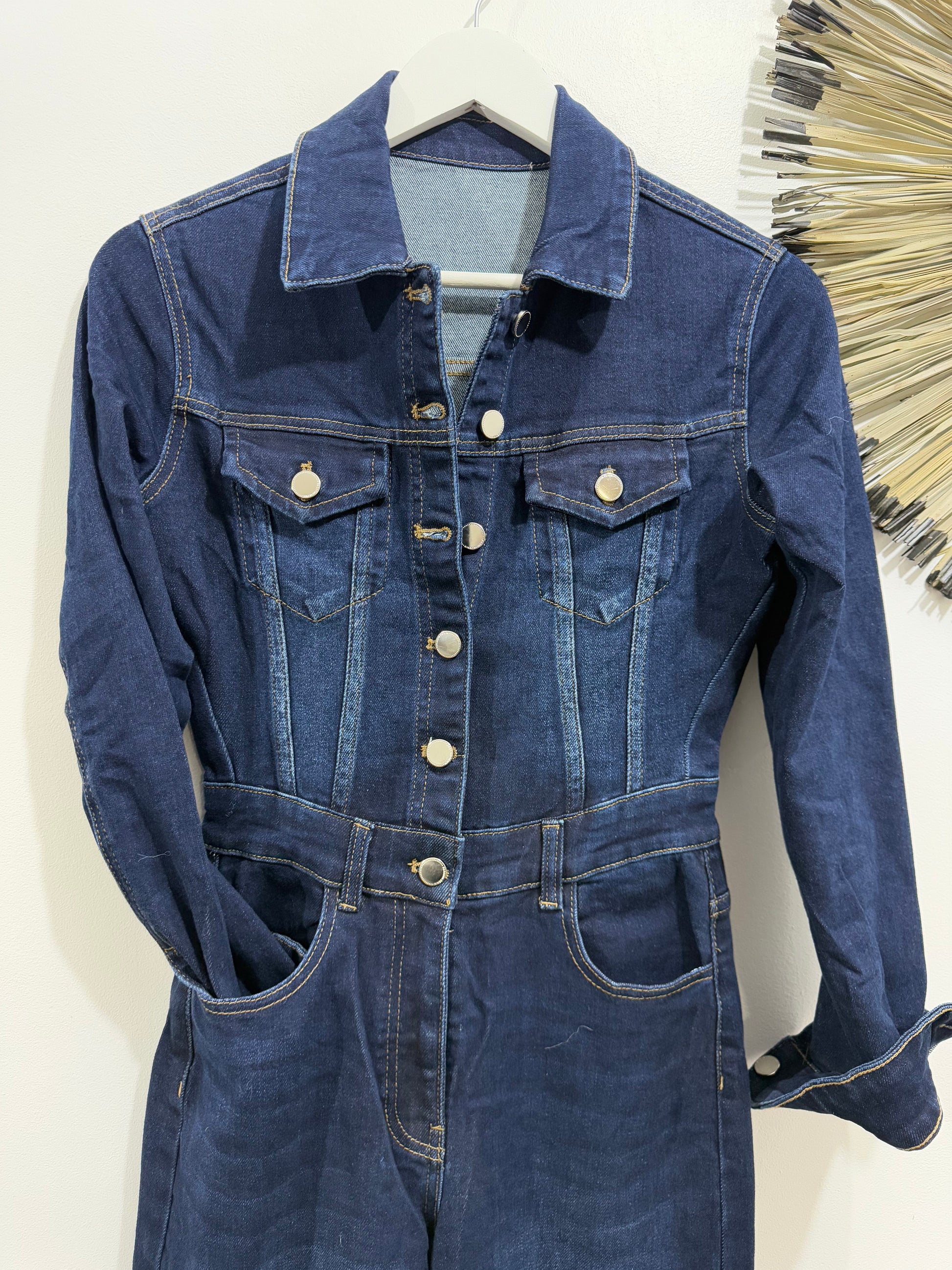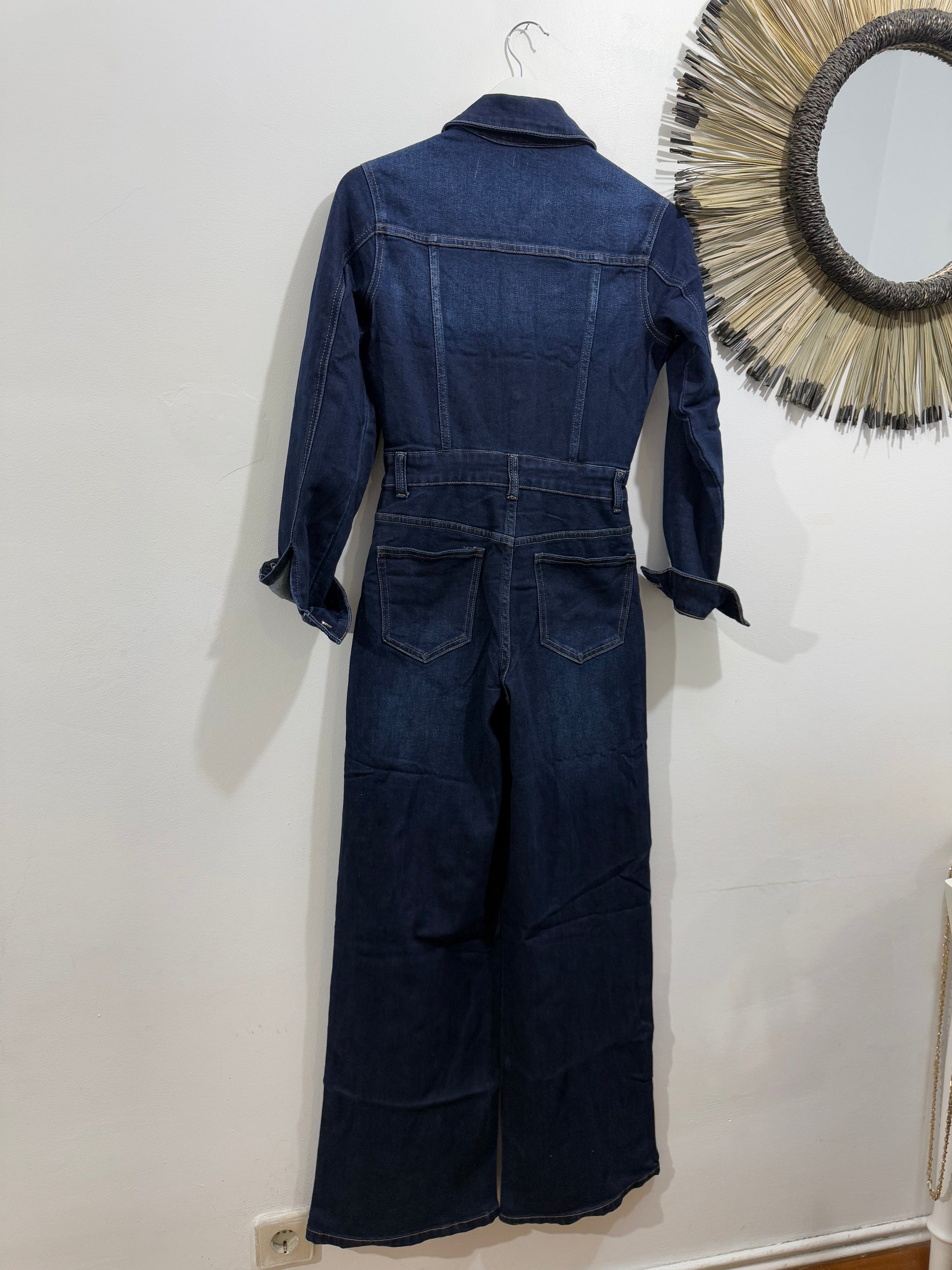 Mono vaquero en tono oscuro. Es elástico y se adapta genial. Abotonado en parte delantera, manga larga. Tiene bolsillos laterales y traseros. Es de corte recto y sienta ideal.