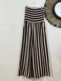 Mono palabra de honor en marrón chocolate y crema. Tiene nido de abeja desde el pecho hasta la cintura. Es súper fluido y fresco. Es de corte recto y tiene bolsillos laterales.