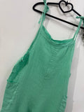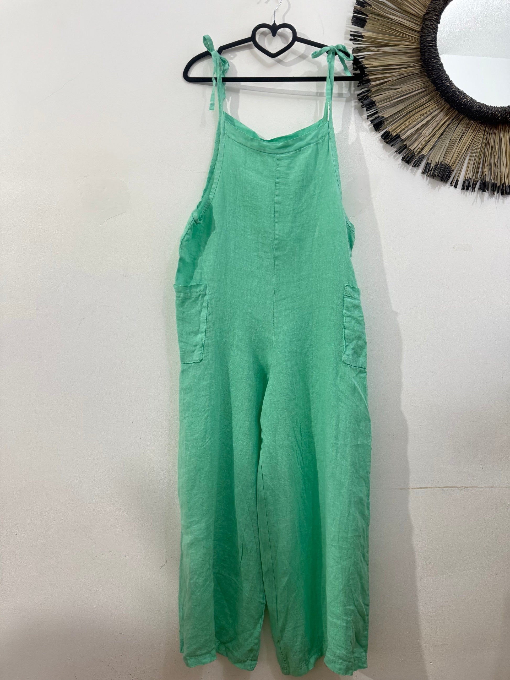 Mono de lino en color turquesa. Tiene tirantes regulables con nudo y bolsillos laterales. Es de corte recto y muy cómodo.