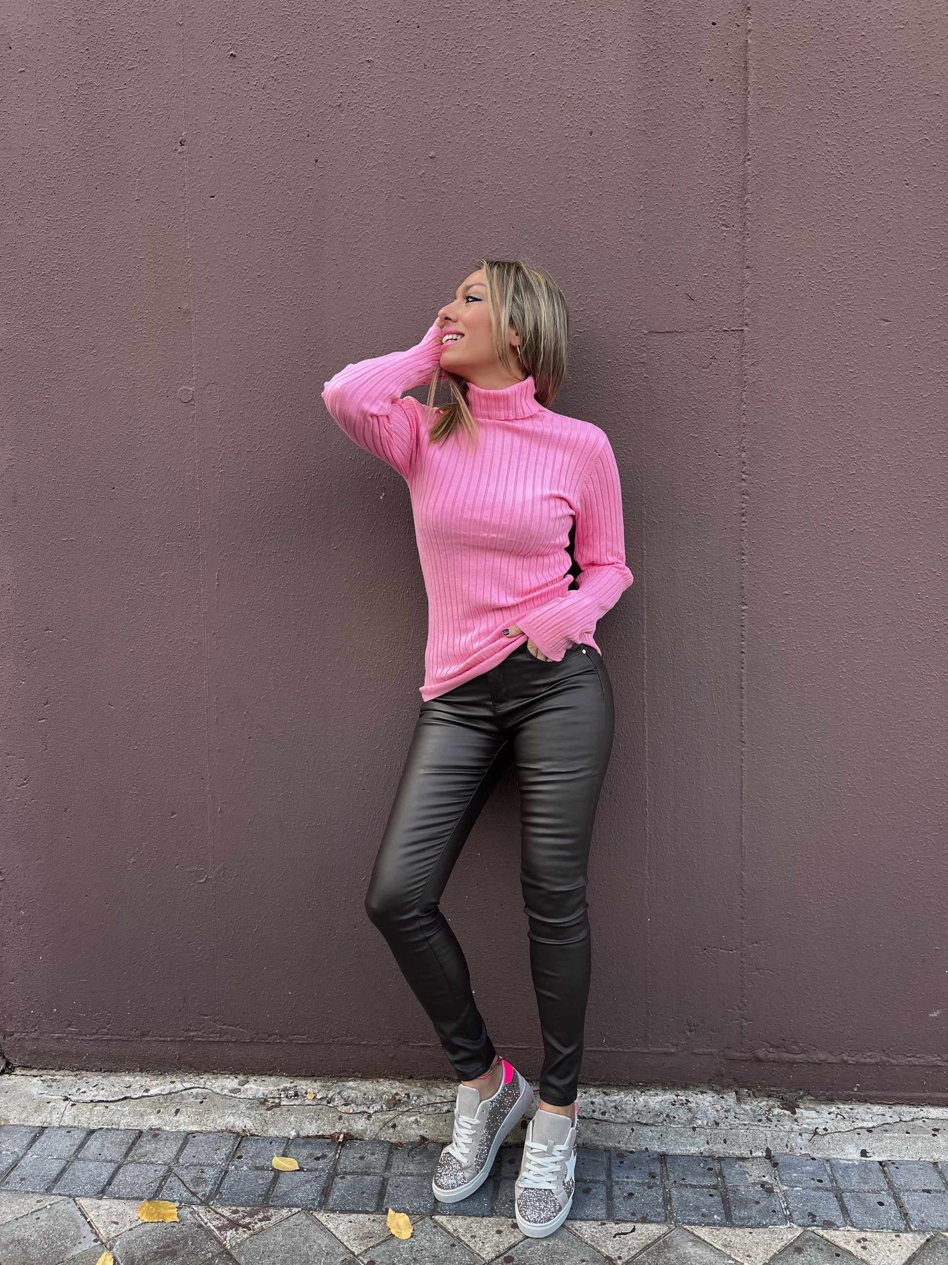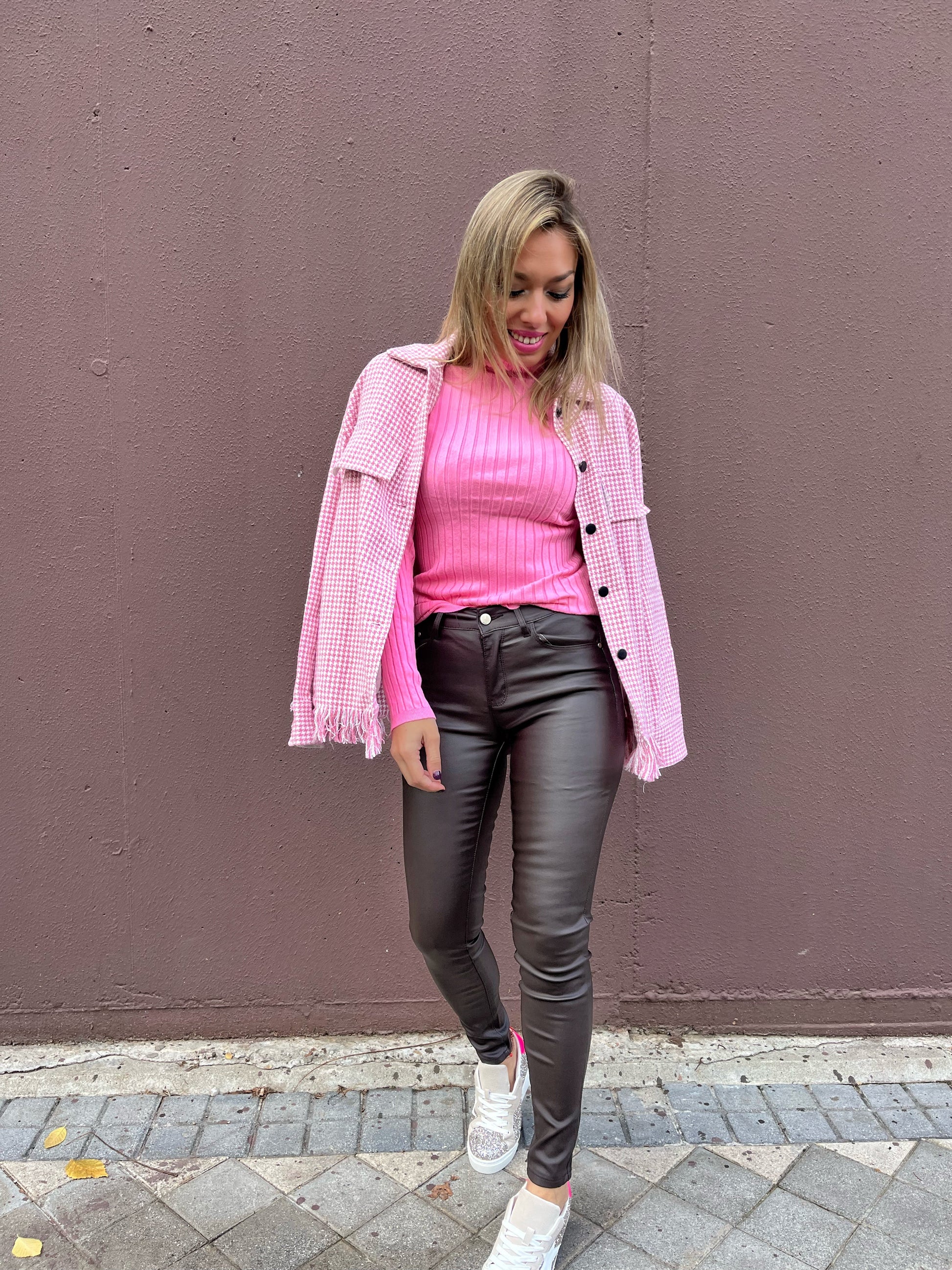 Pantalón encerado en color marrón chocolate. Es pitillo y elástico, tiro medio/alto. Es push up y sienta genial. Bolsillos laterales y traseros.
