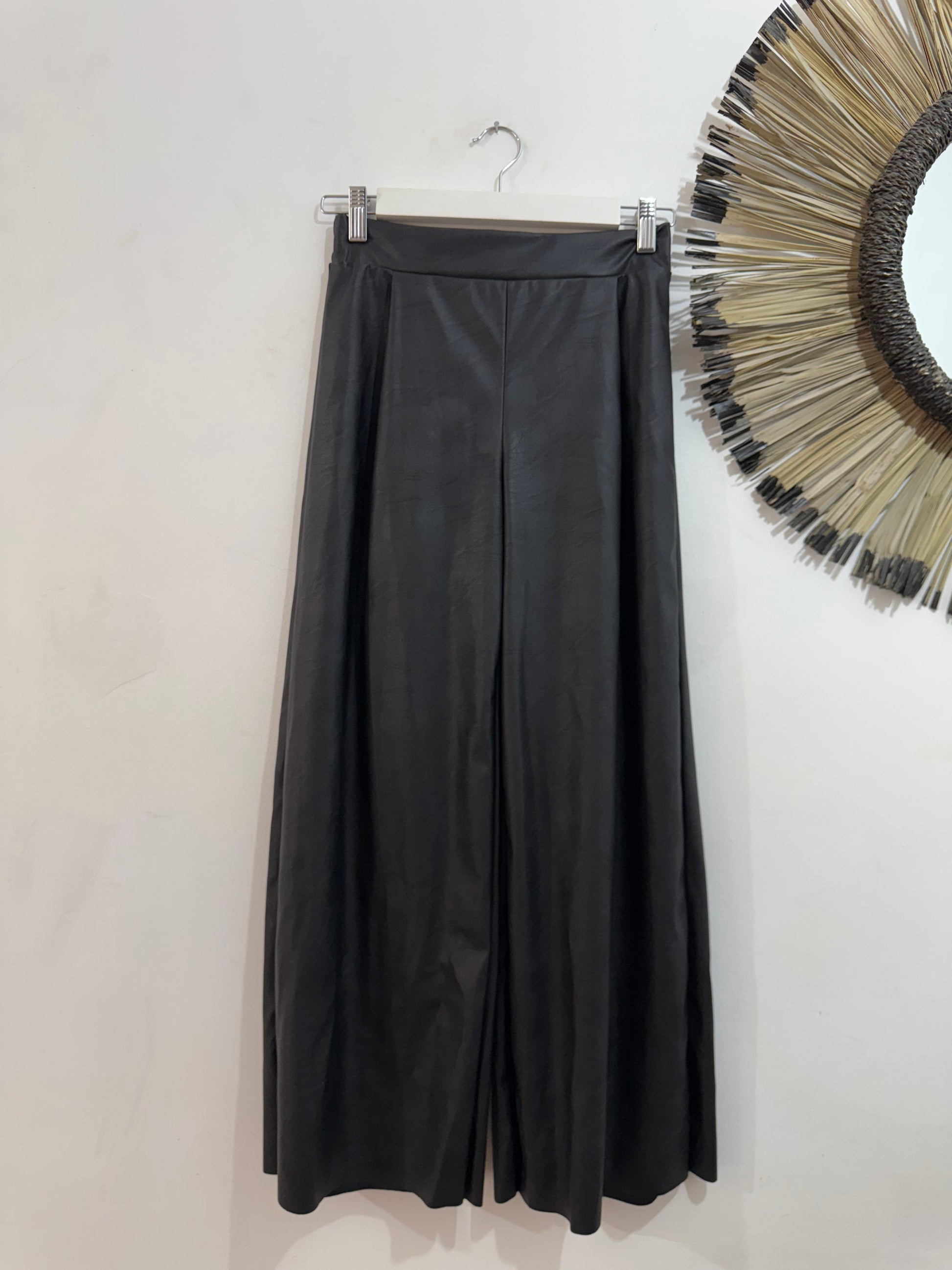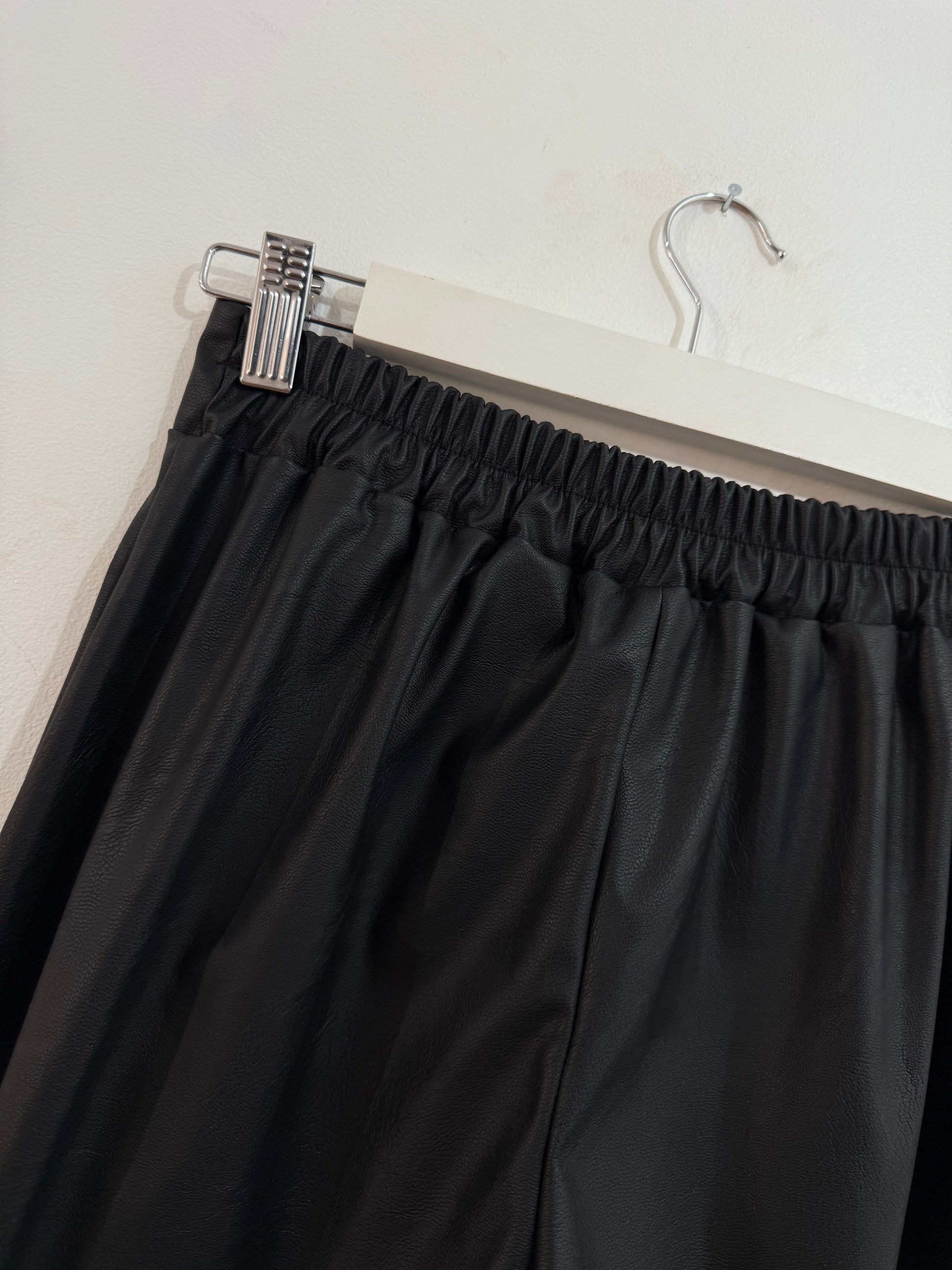 Pantalón tipo culotte de polipiel en color negro. Tiene goma en la cintura por la parte de atrás y bolsillos laterales.