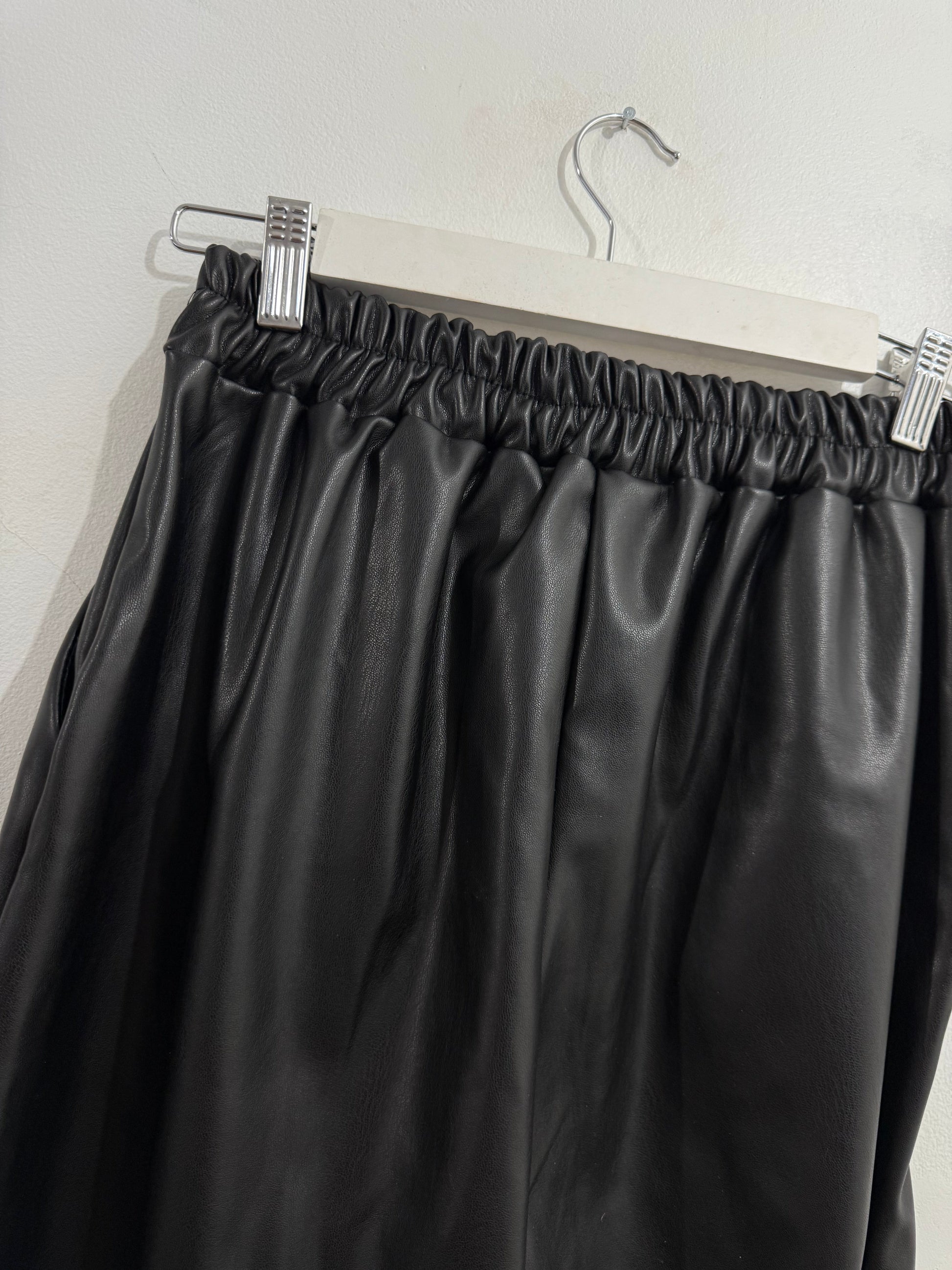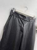 Pantalón de polipiel en color negro. Es de tiro medio/alto. Tiene goma en la cintura en la parte de atrás y botones en parte delantera. Bolsillos laterales. Es tobillero.