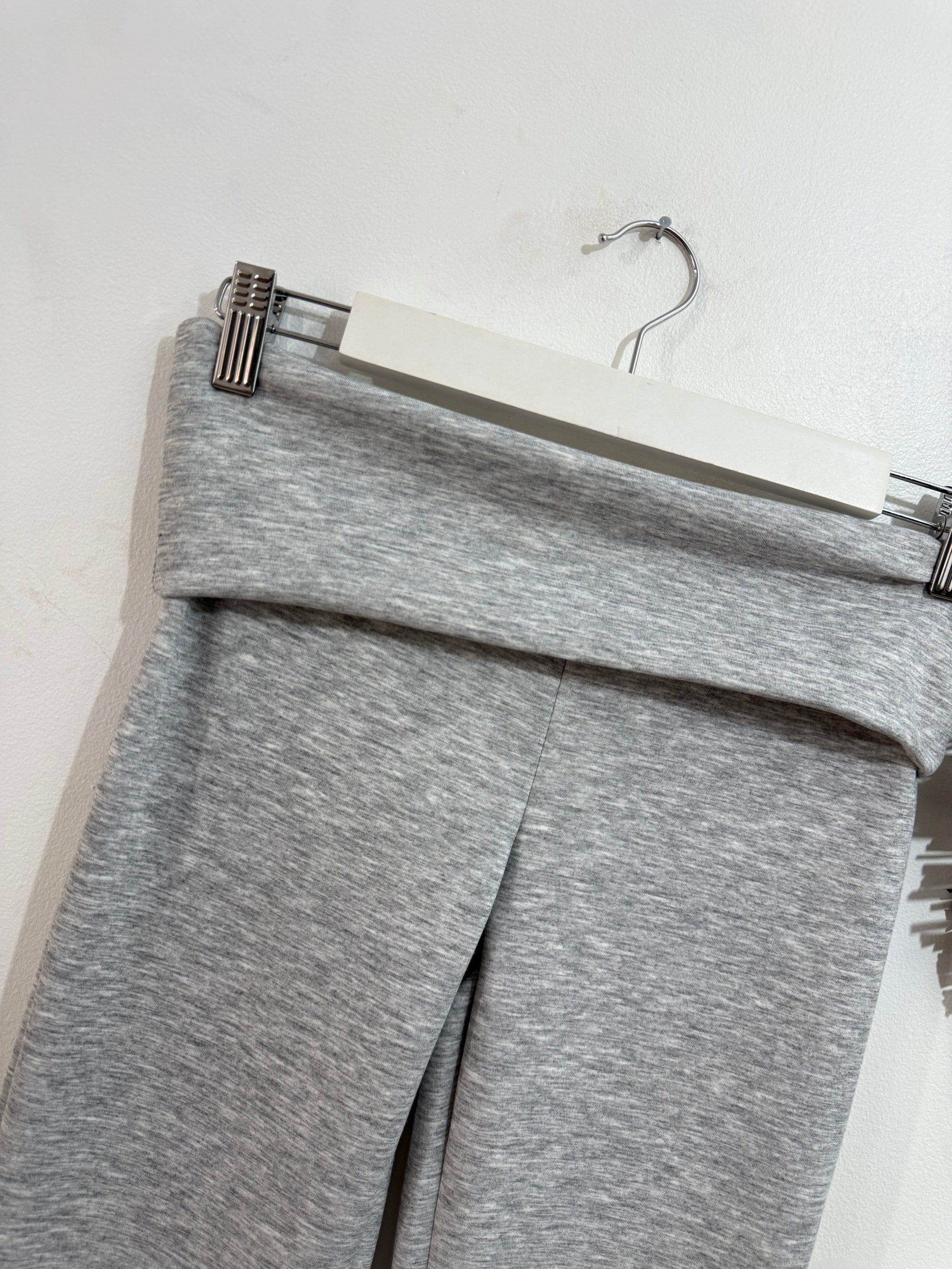 Pantalón de punto frío (tipo neopreno finito) en color gris jaspeado. Es elástico, tiene vuelta en la cinturilla y es pegadito de pierna y termina en una campana muy discreta.