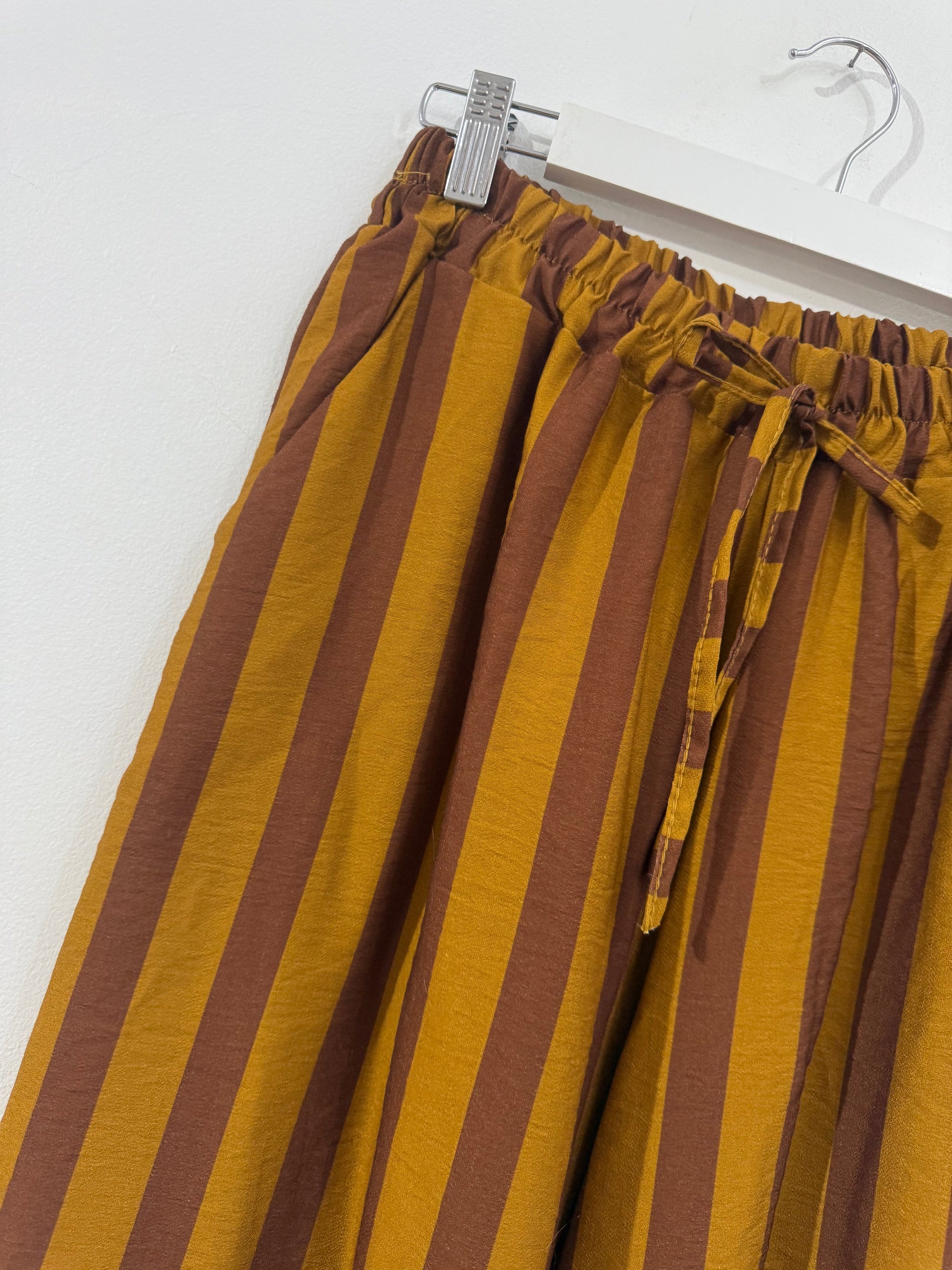 Pantalón de viscosa fluido de corte recto en color mostaza con raya vertical en marrón. Tiene bolsillos laterales y goma en la cintura, se ajusta genial.