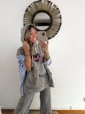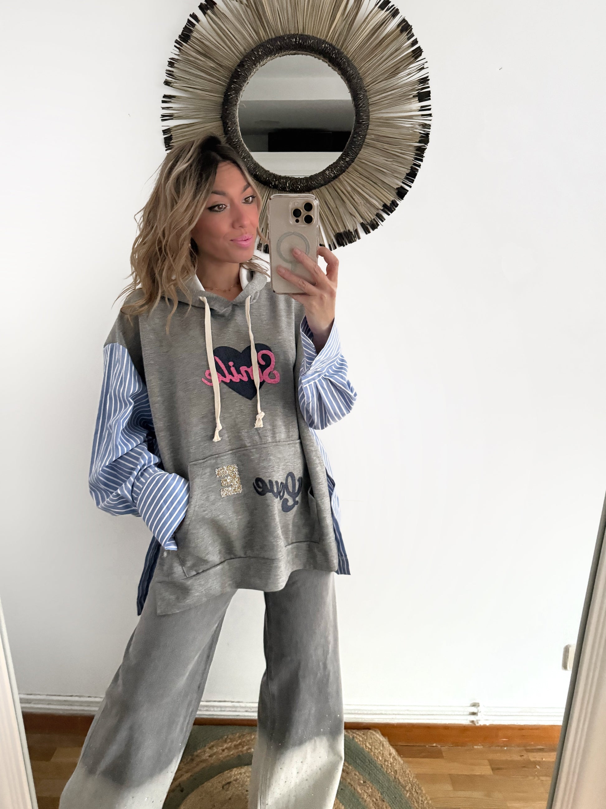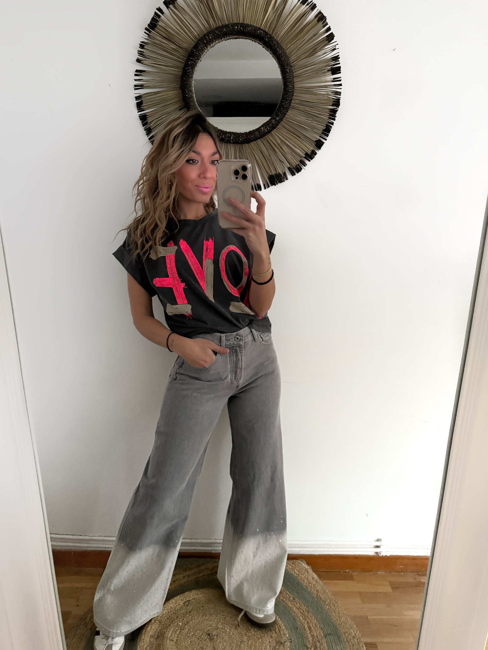 Vaquero en color gris con el bajo Tie Dye en color blanco. El bajo lleva Strass plateado. Es de tiro medio y de corte recto. No tiene elastano. Tiene bolsillos en parte delantera y trasera. Sienta ideal.