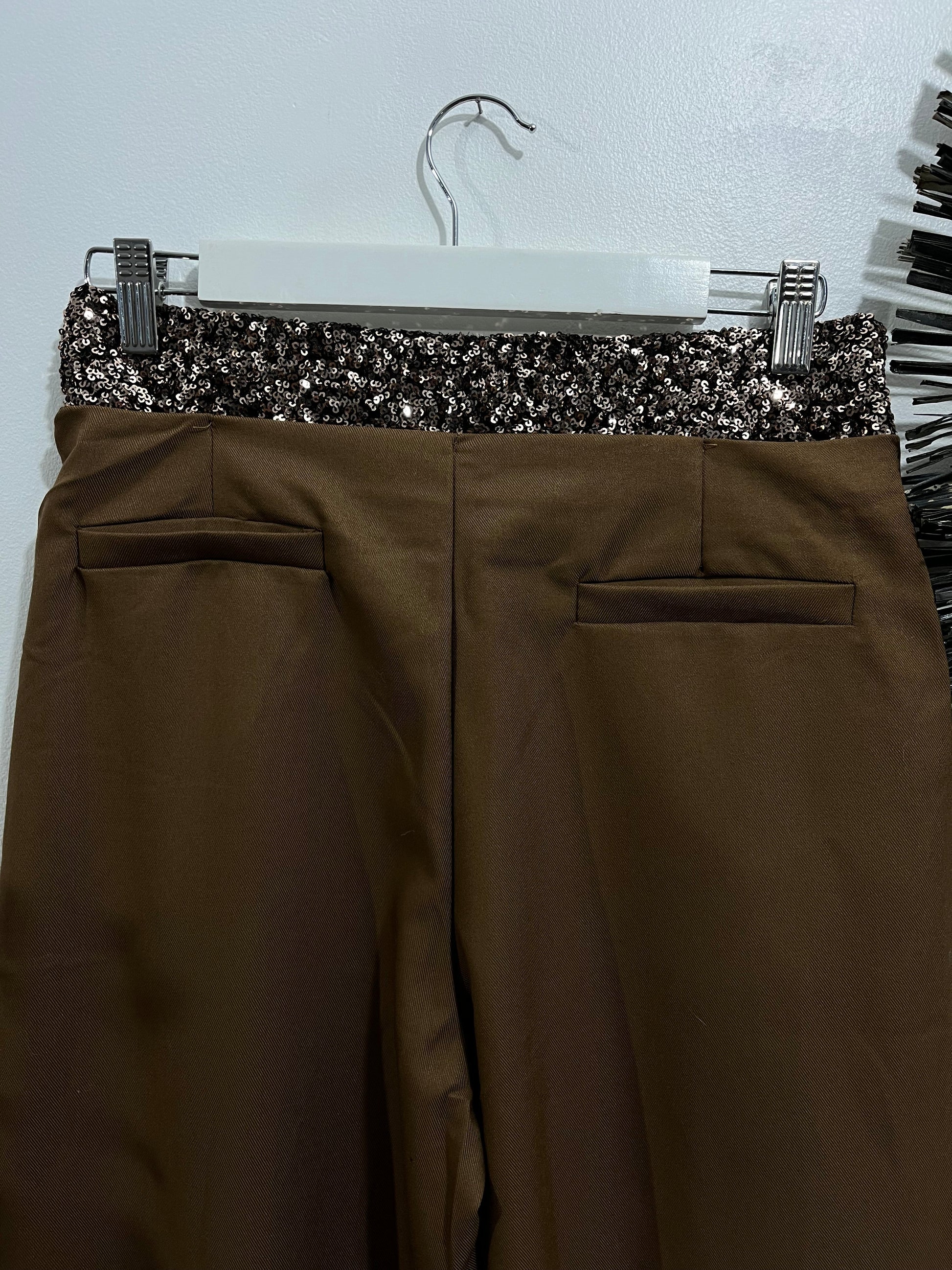Pantalón de pinzas y corte recto en color marrón. Tiene bolsillos laterales , falsos bolsillos tipo chino en parte trasera y detalle de franja de lentejuelas marrones en la cintura. Sienta genial.
