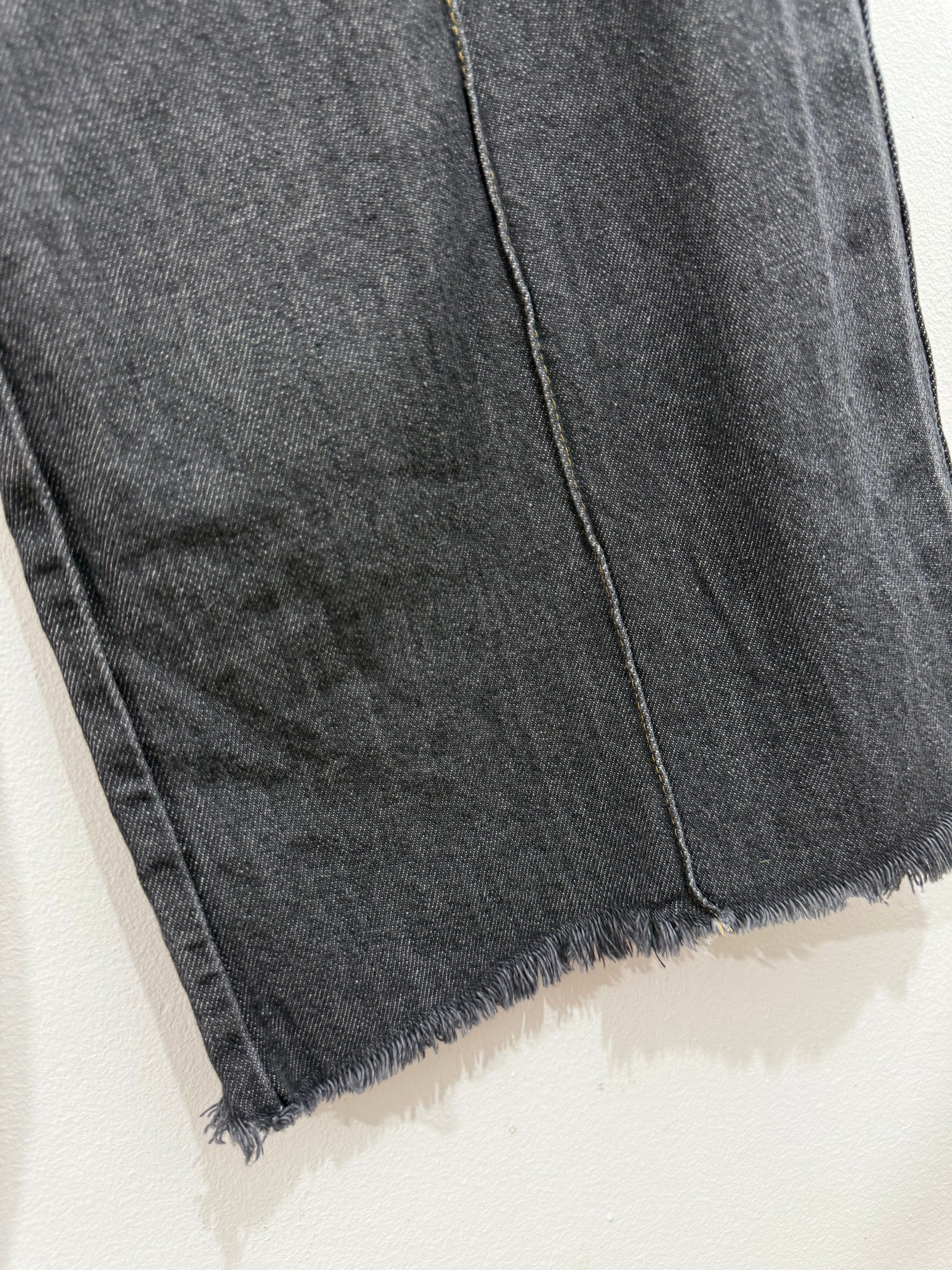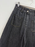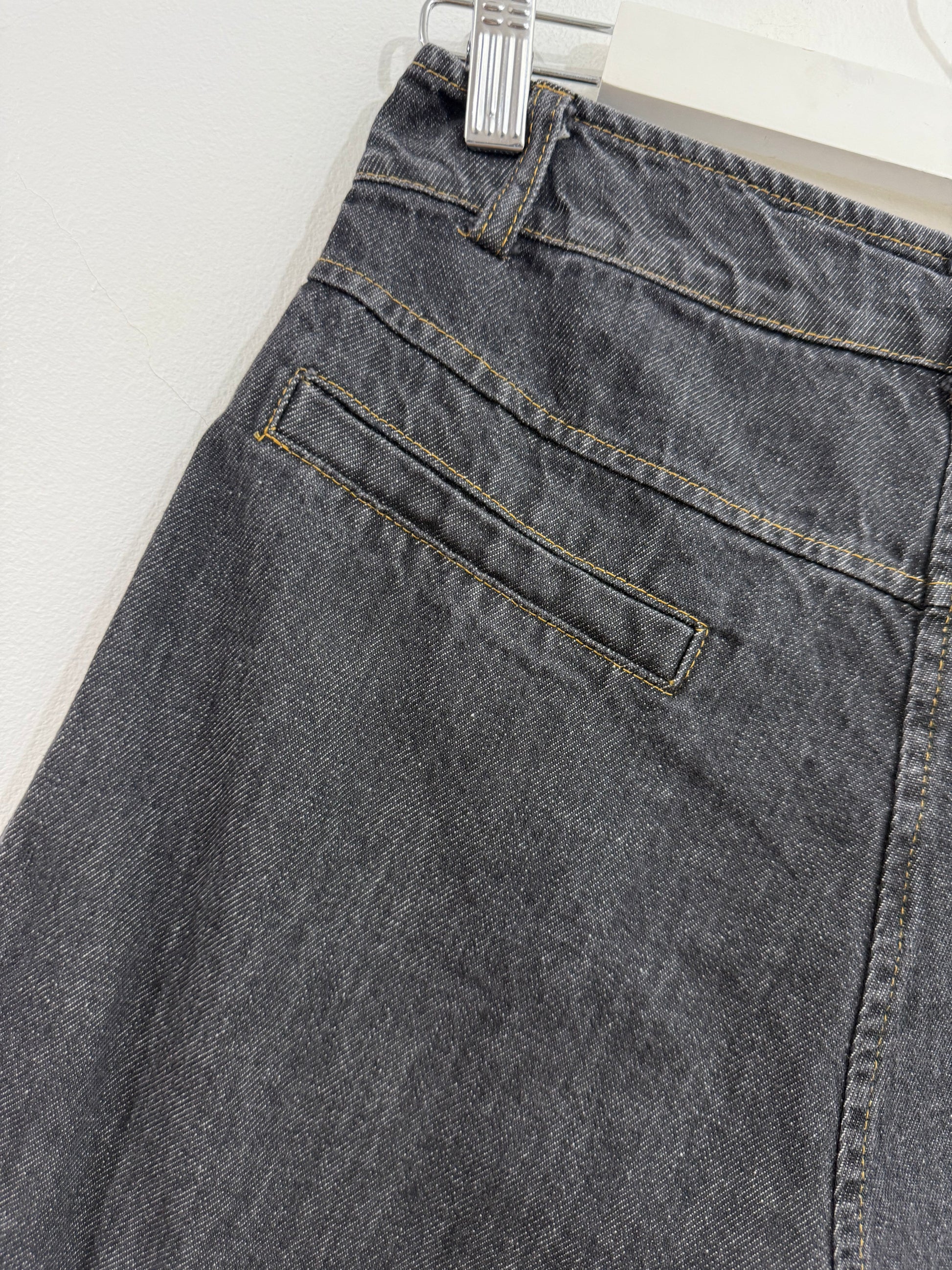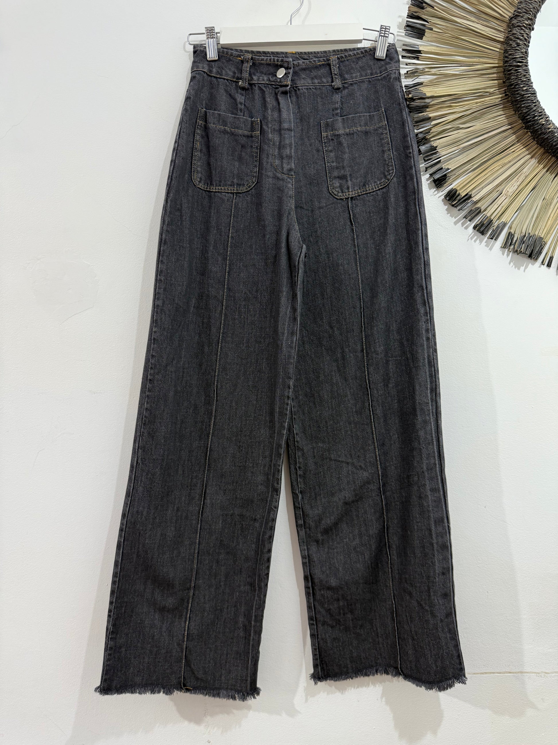 Vaquero en tono oscuro/grisaceo. No tiene elastano. Es de tiro medio alto. Es de corte recto y desflecado de bajo. Tiene bolsillos en parte frontal y falsos bolsillos tipo chino en la parte trasera.