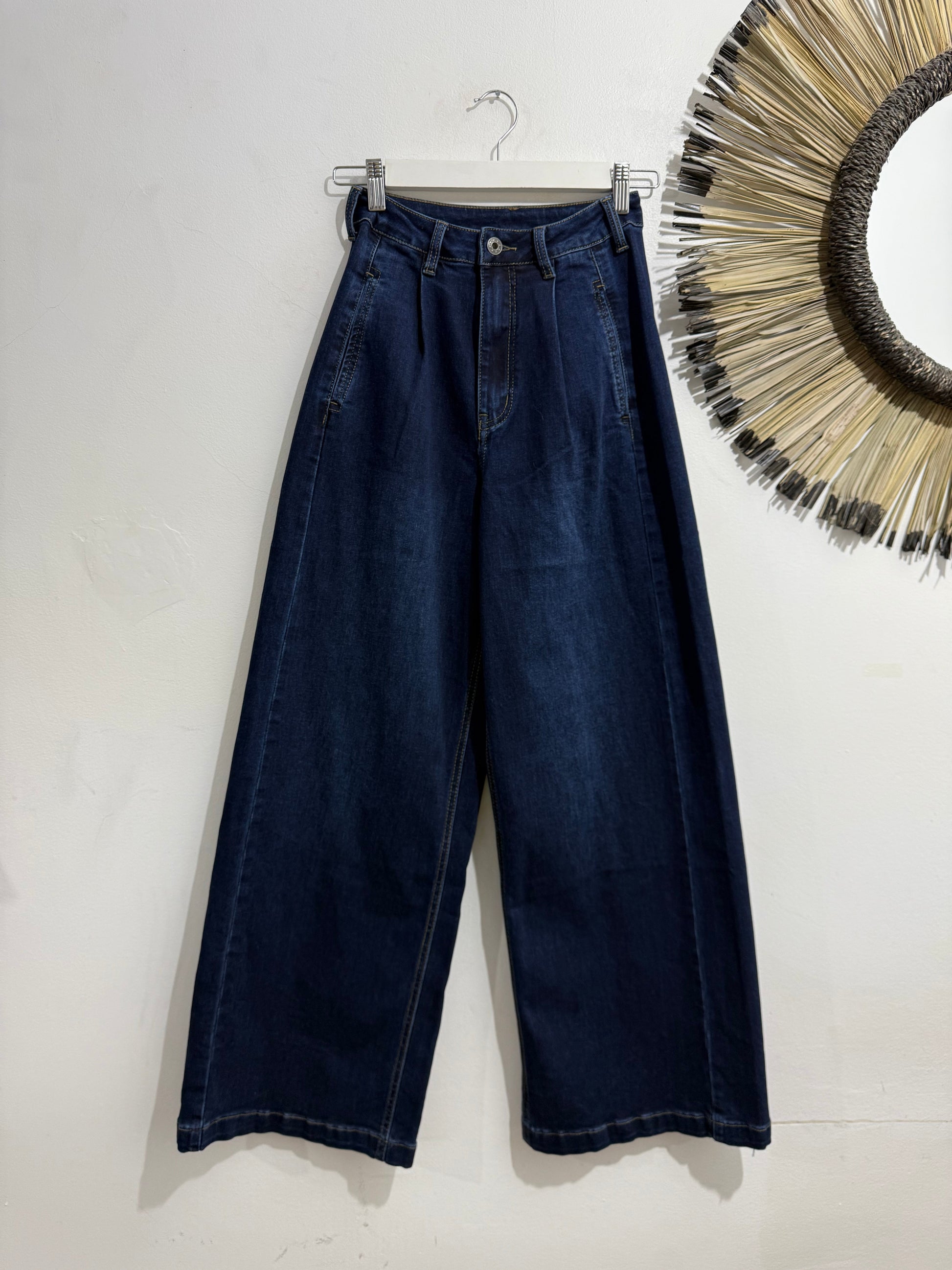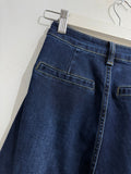 Vaquero en tono oscuro de corte recto con bolsillos laterales y falsos bolsillos tipo chino en parte trasera. Es elástico.