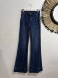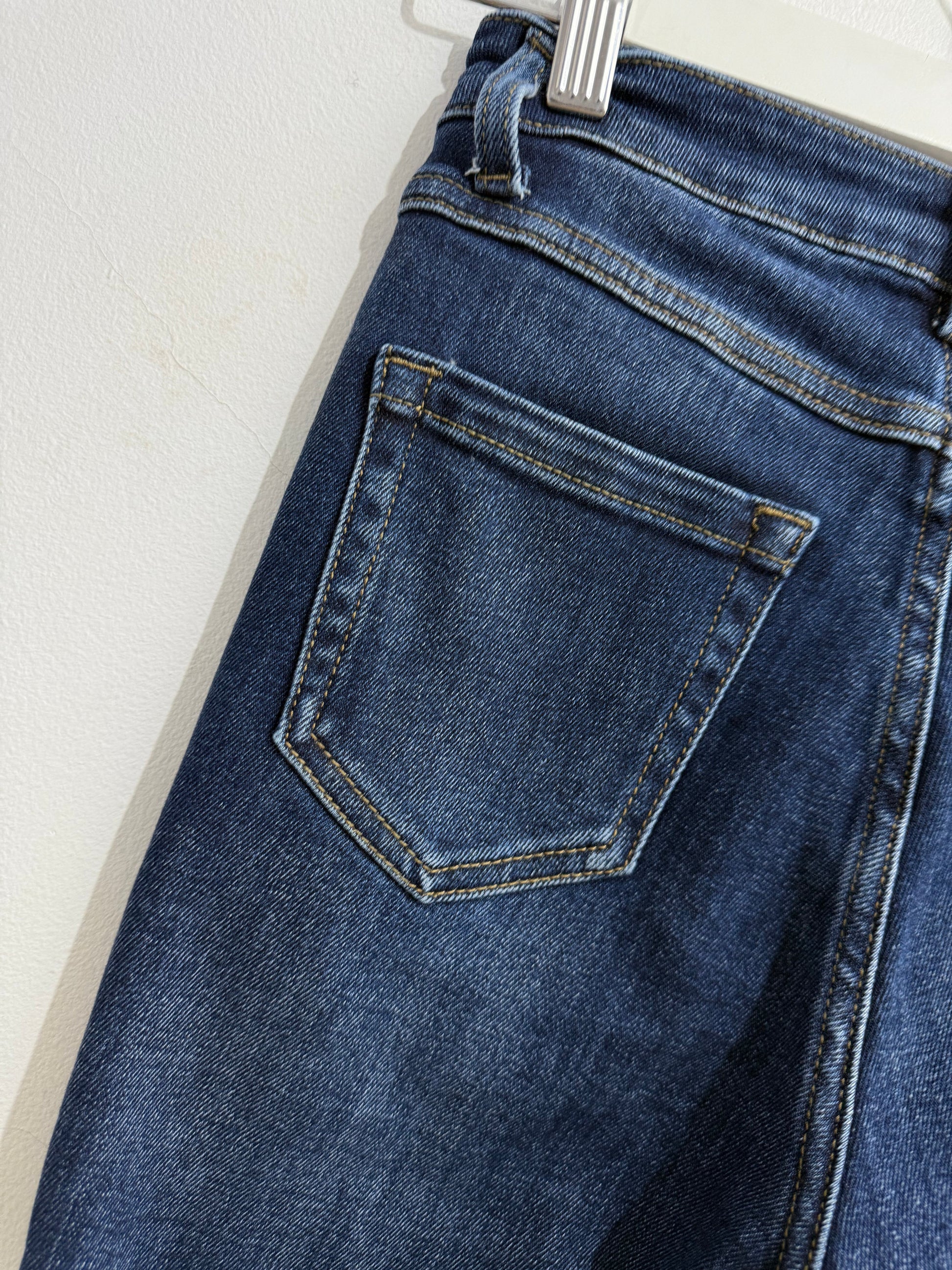 Vaquero elástico en tono medio/oscuro con partes más claras. Es de tiro medio y sienta genial. Tiene bolsillos laterales y en parte trasera. Pegado de pierna y termina en campana. Tiene Maxi bajo.