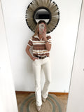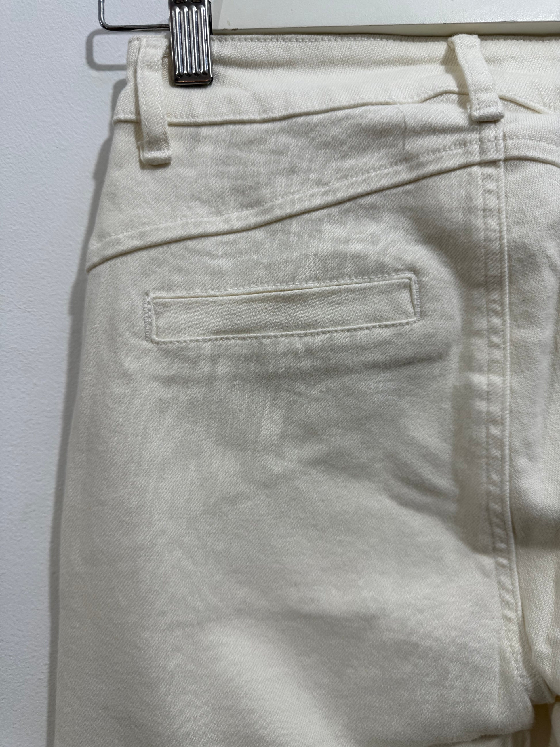 Vaquero elástico en color blanco roto. Es de tiro medio. Es pegado de pierna y termina en una campana muy sutil. Tiene bolsillos en parte delantera y los bolsillos de la parte de atrás son tipo chino. Es push up, elástico y se adapta genial.