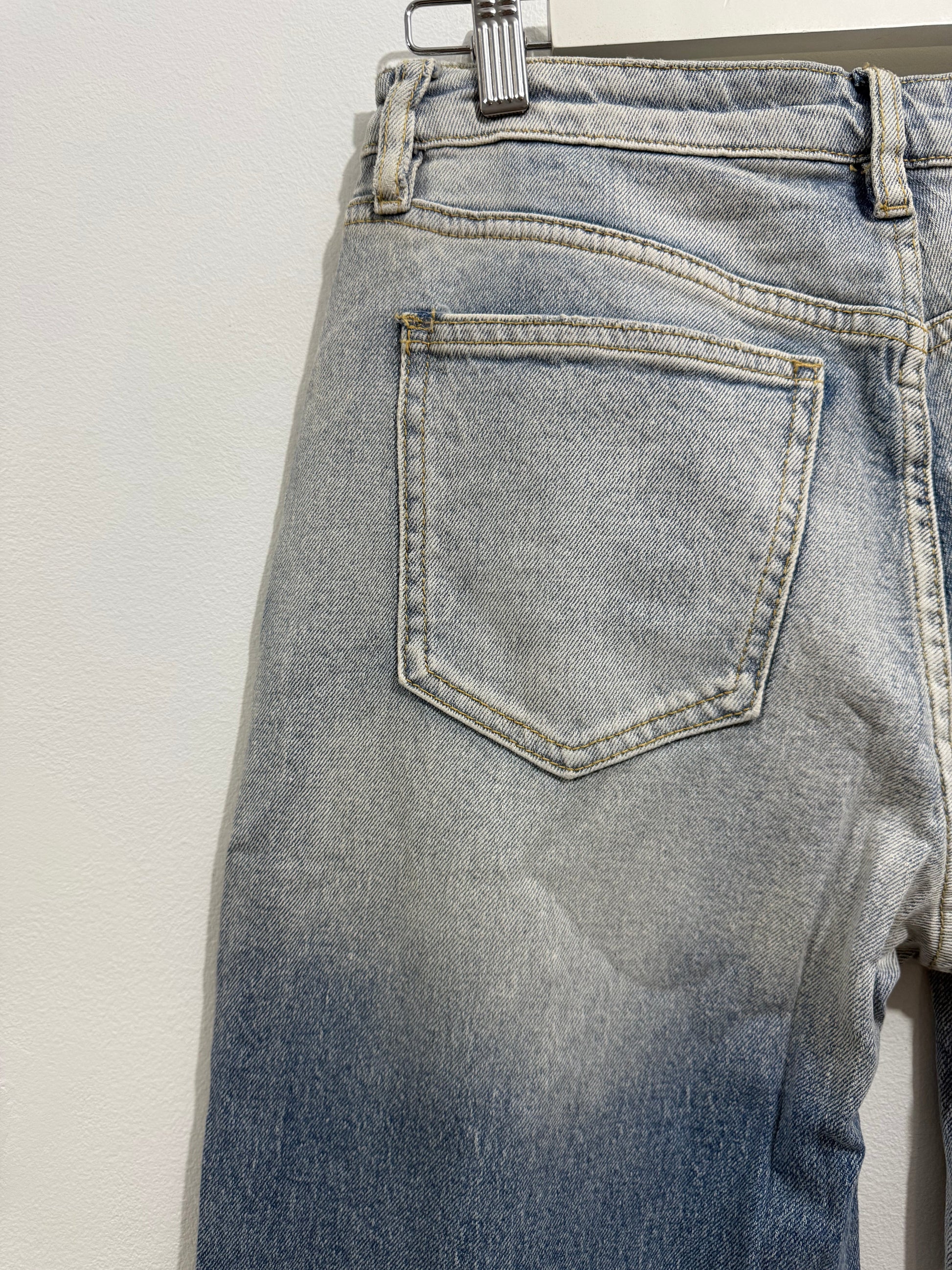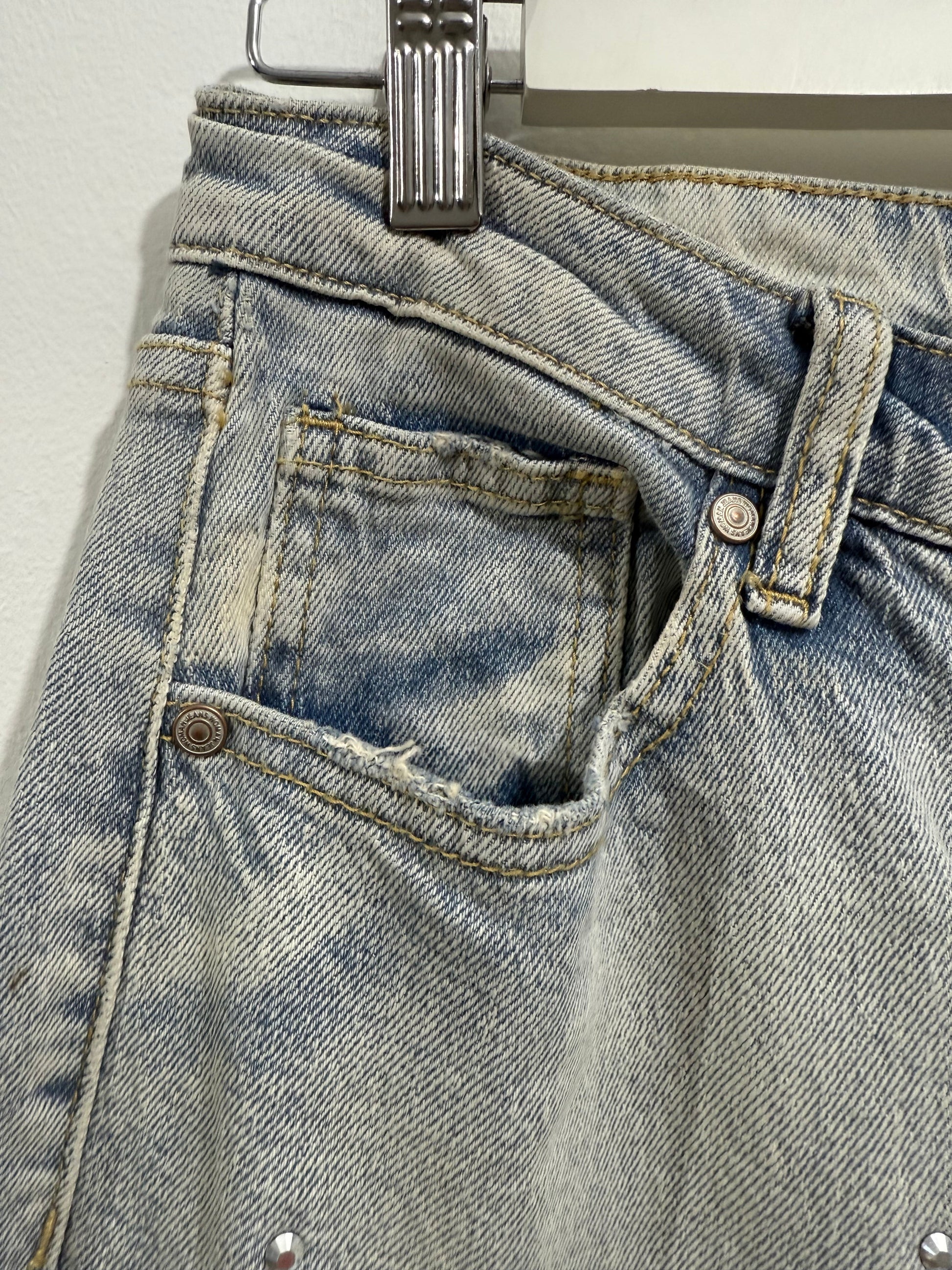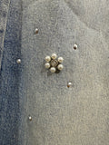 Vaquero de corte recto y de tiro medio. Tono medio/clarito. Lleva piedras de Strass y perlas blancas con formas de mini florecitas en parte delantera. Tiene muy poquito elastano. Bolsillos en parte delantera y trasera.