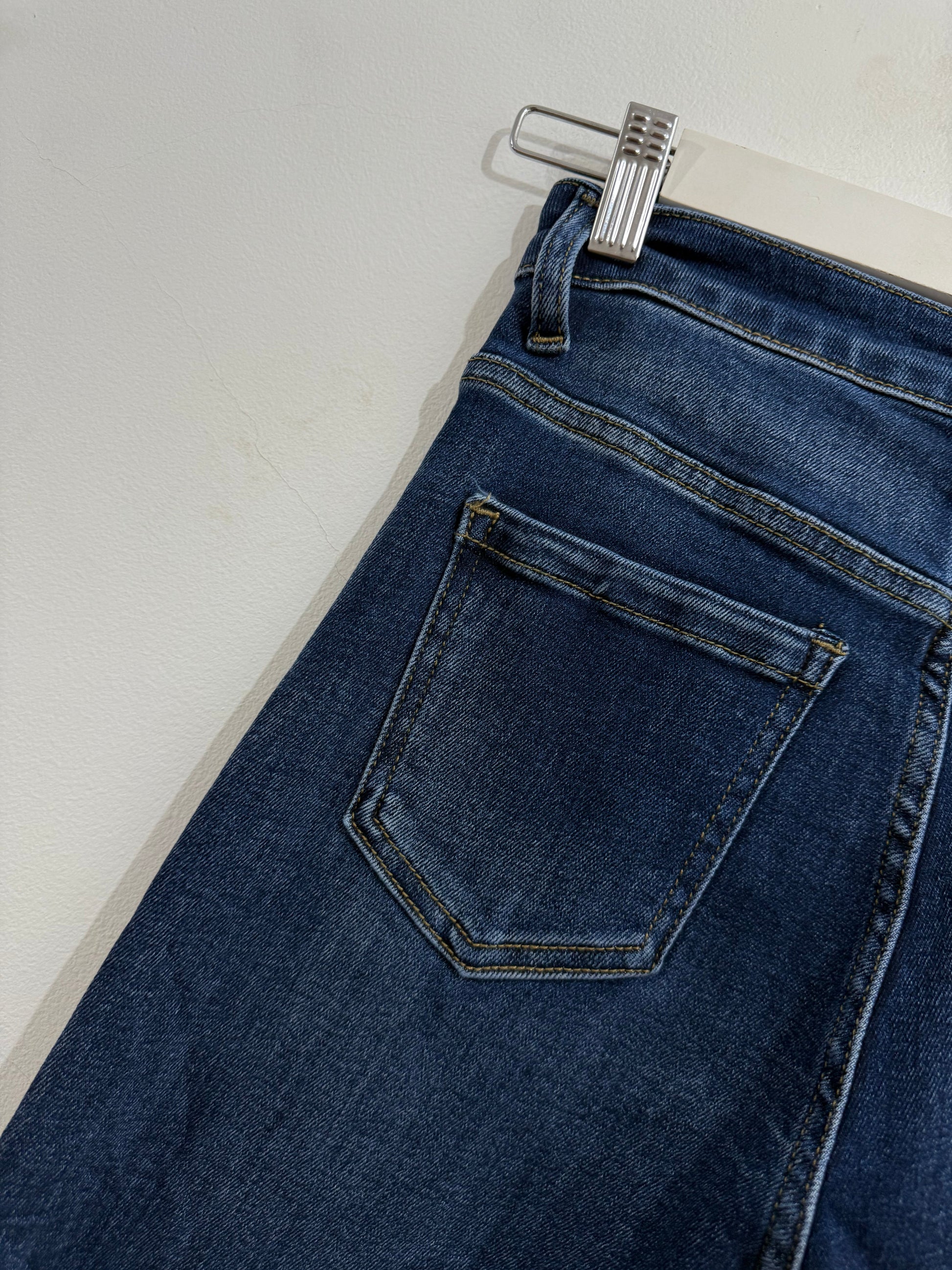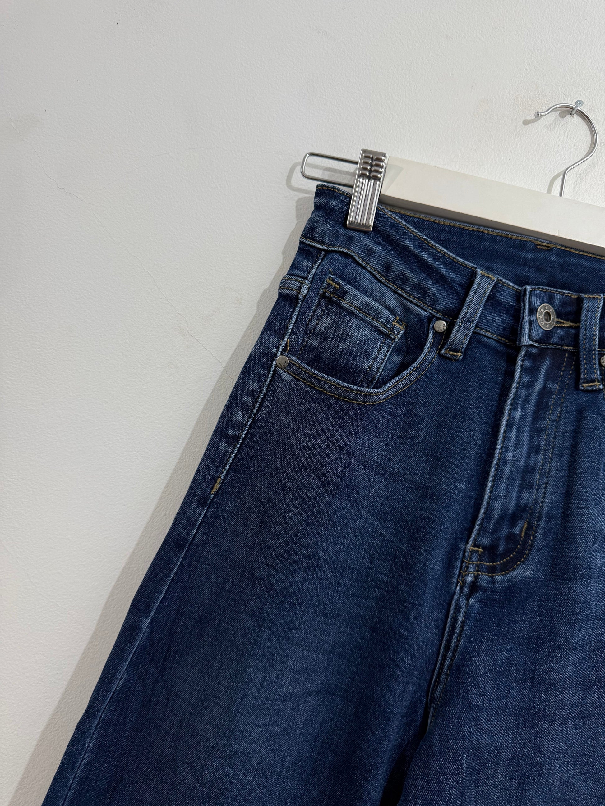Vaquero en tono oscuro de tiro alto y de pierna con corte Palazzo. Es súper cómodo y tiene elastano. Bolsillos en parte delantera y en parte trasera.