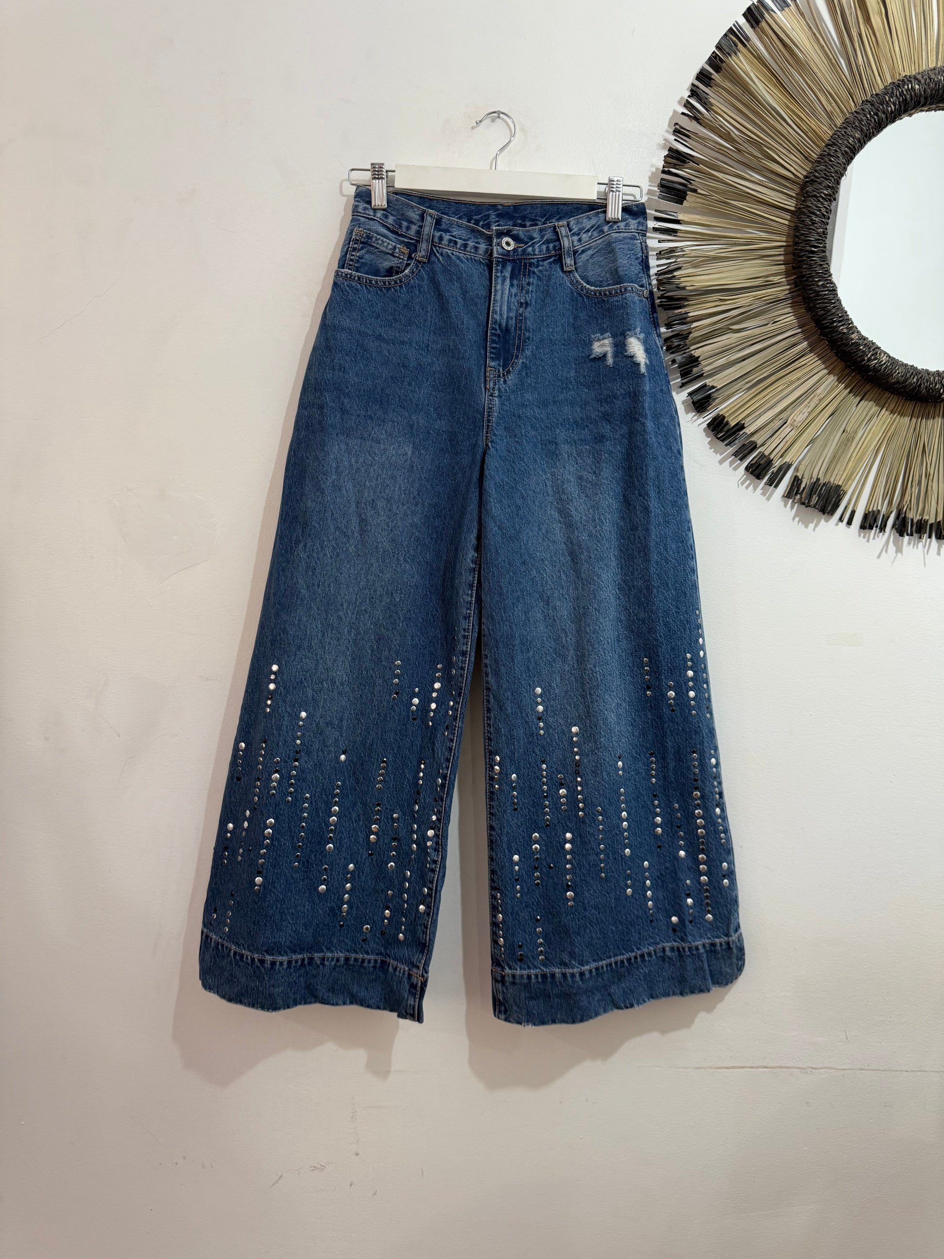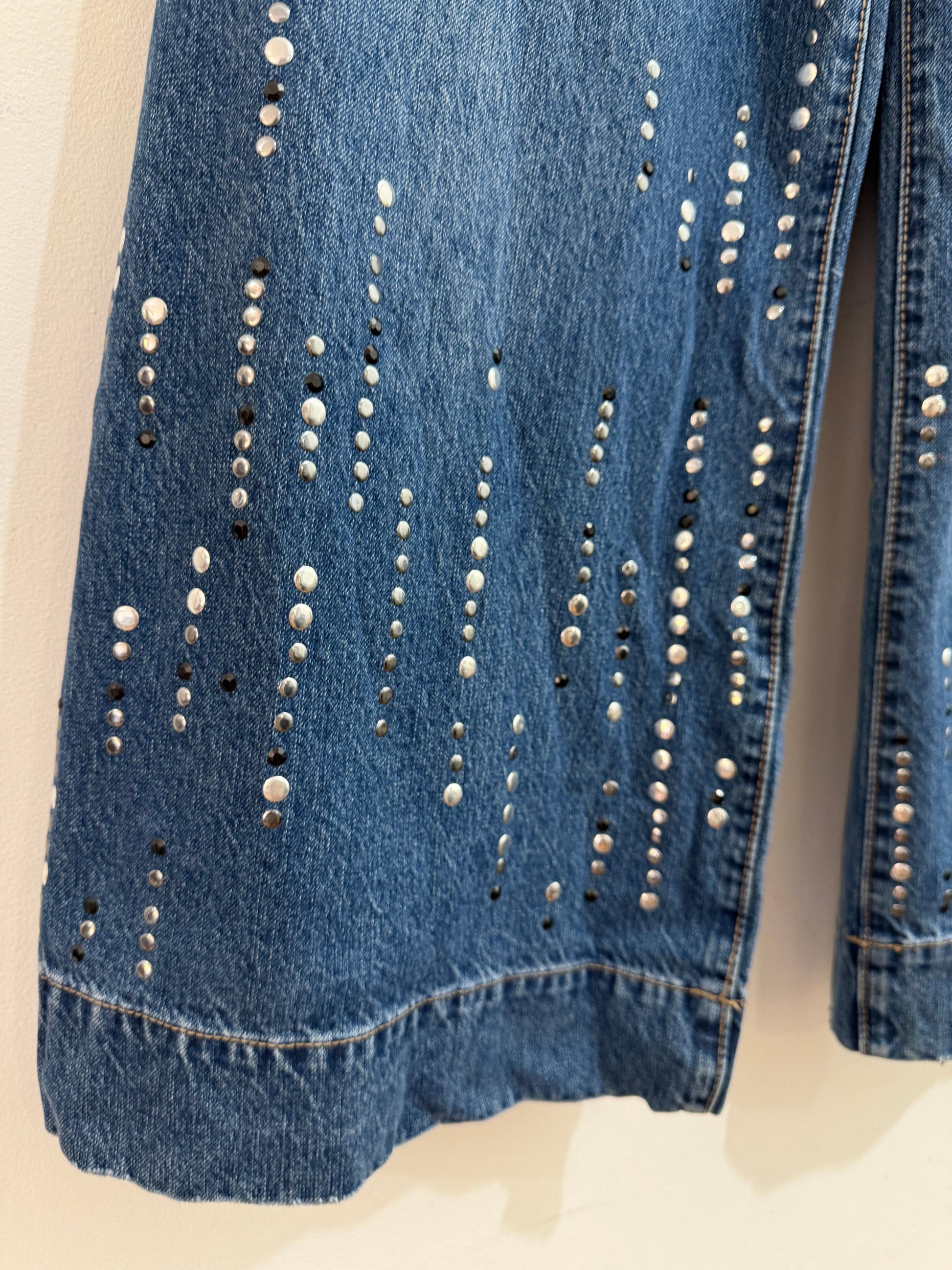 Vaquero sin elastano de corte recto con tachas planas plateadas y negras en el bajo. Es tobillero y de tiro medio. Tiene bolsillos en parte delantera y trasera.