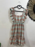 Vestido corto de algodón, viscosa y poliéster. Estampado de cuadros en tonos pastel, rosa, amarillo, turquesa y camel. Escote cuadrado con volantes mini en tirantes. Anudado a la espalda. Tiene goma en la cintura en la parte de atrás, se ajusta genial y tiene bolsillos laterales.