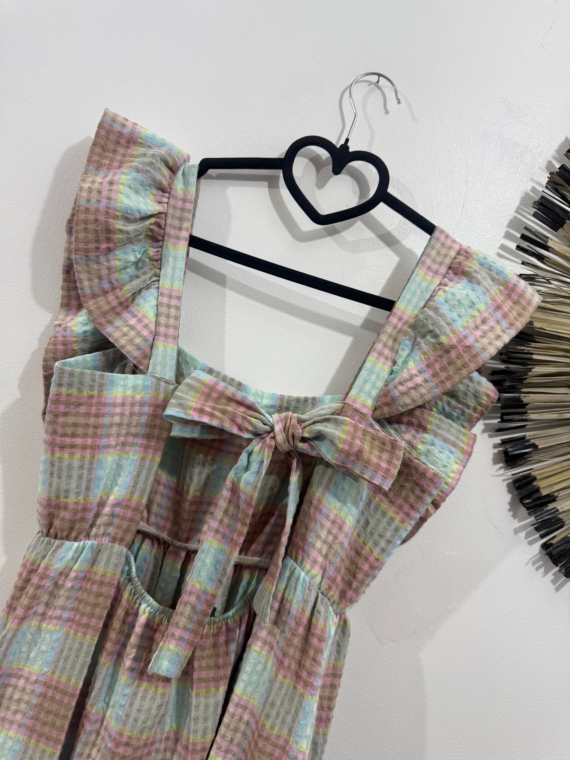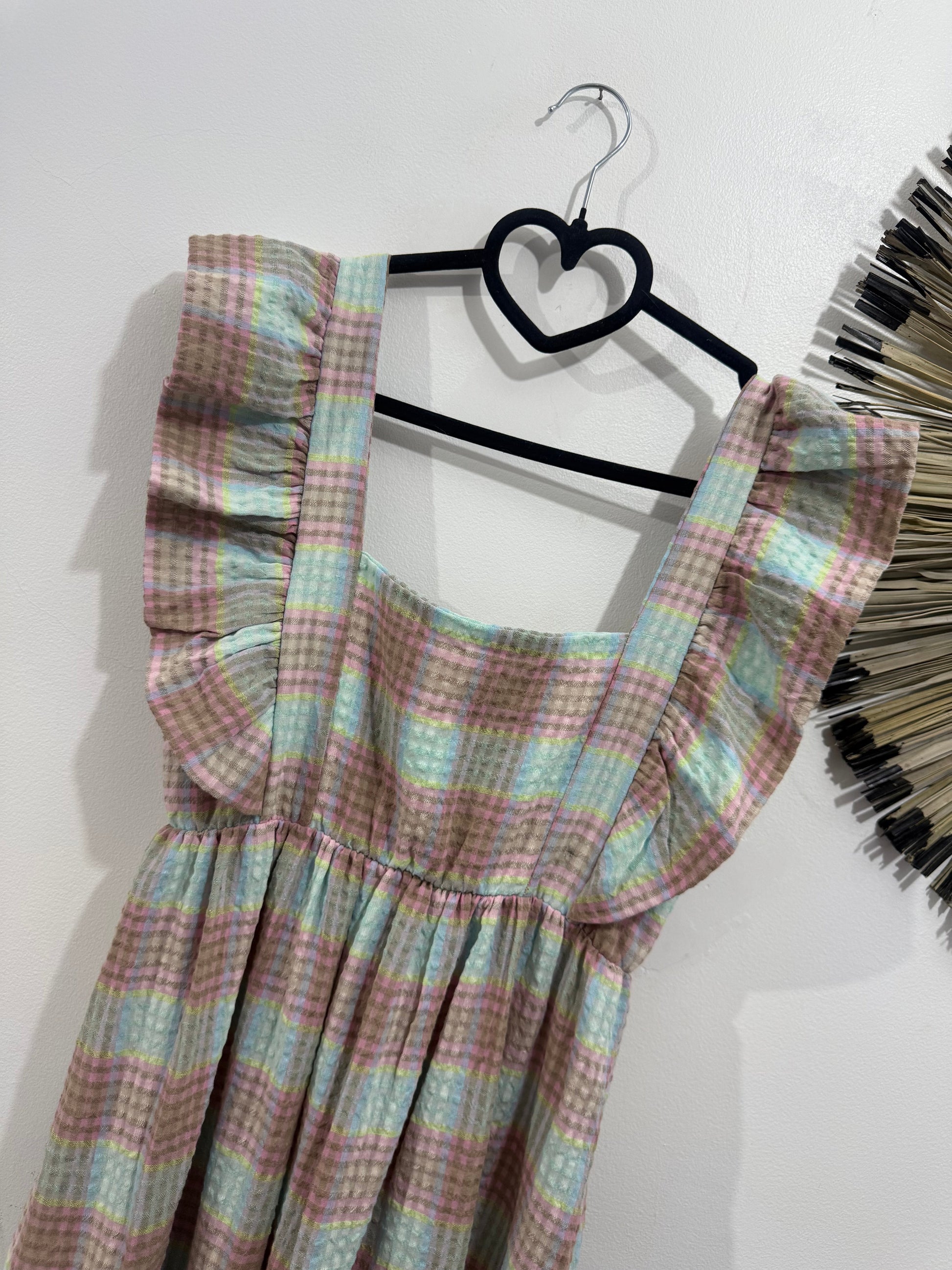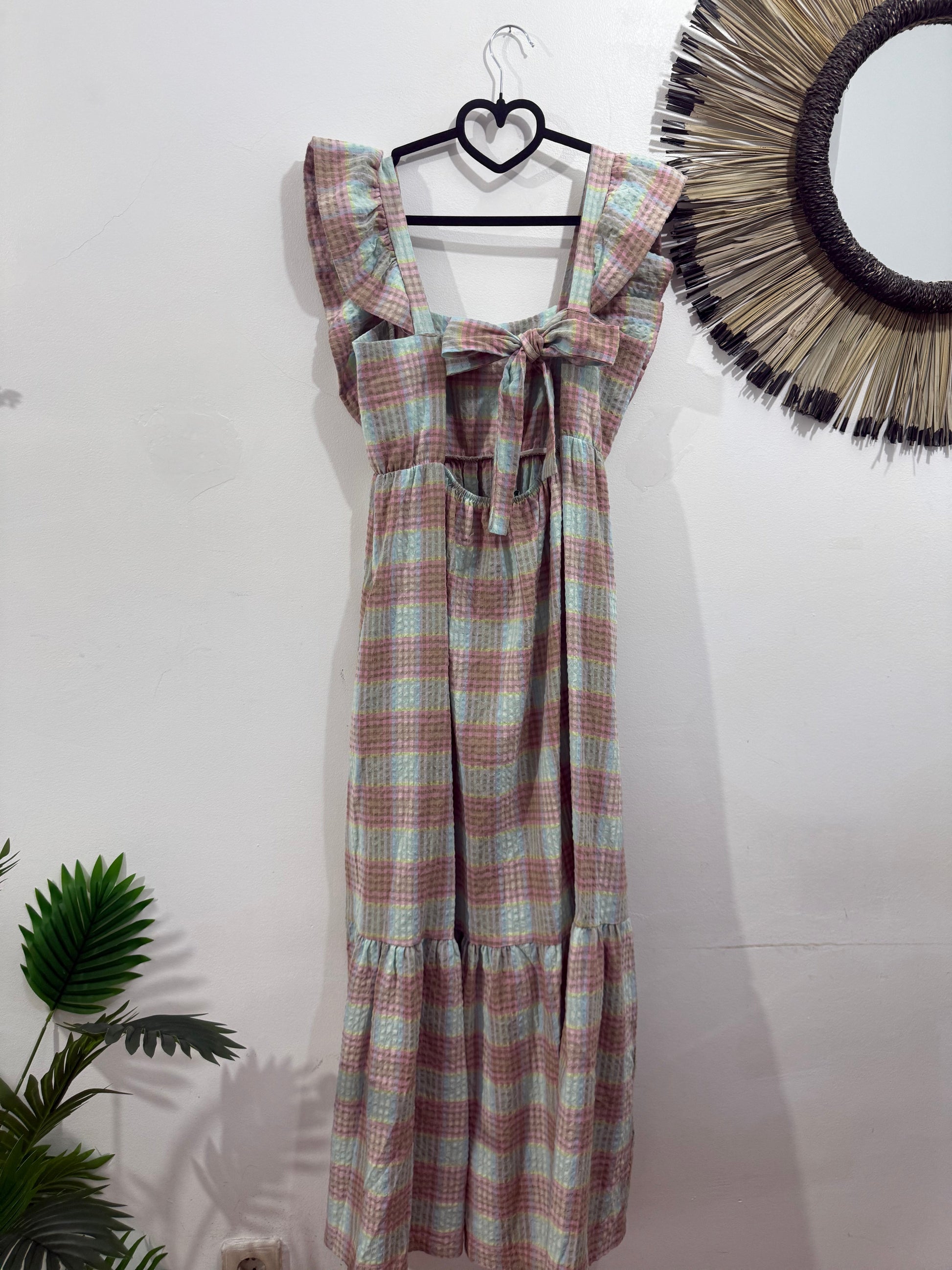 Vestido largo de algodón, viscosa y poliéster. Estampado de cuadros en tonos pastel, rosa, amarillo, turquesa y camel. Escote cuadrado con volantes mini en tirantes. Anudado a la espalda. Tiene goma en la cintura en la parte de atrás, se ajusta genial y tiene bolsillos laterales.