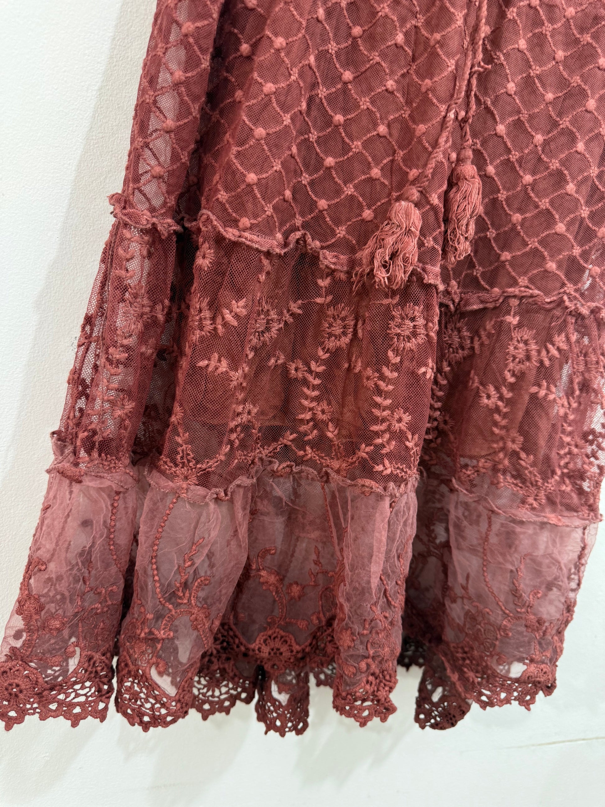 Vestido de encaje y crochet en color teja. Es de manga tipo sosa y lleva franjas de tul; encaje y crochet. Lleva abertura con cordones en el escote y tiene incluido vestido interior de tirantes en el mismo tono.