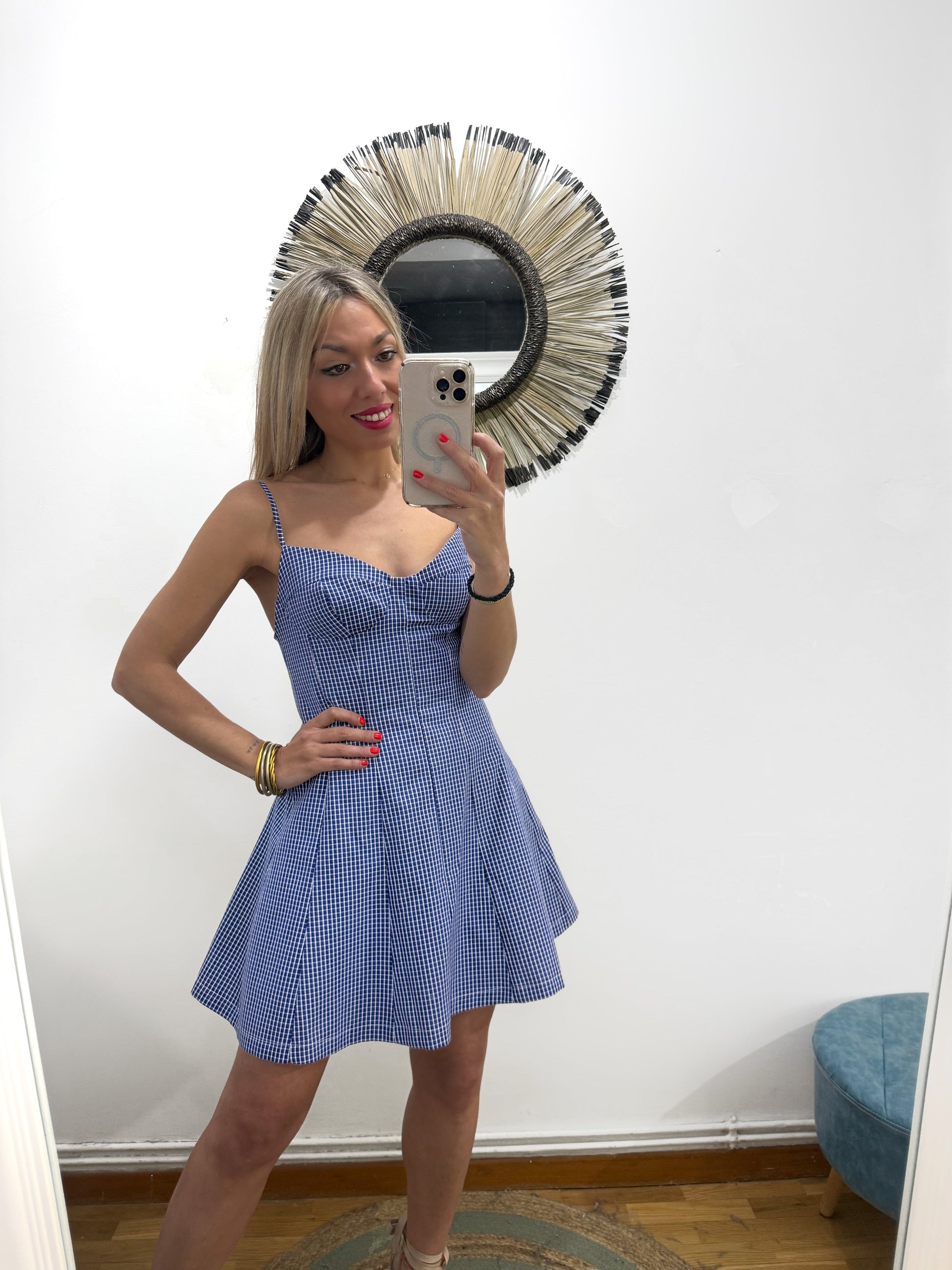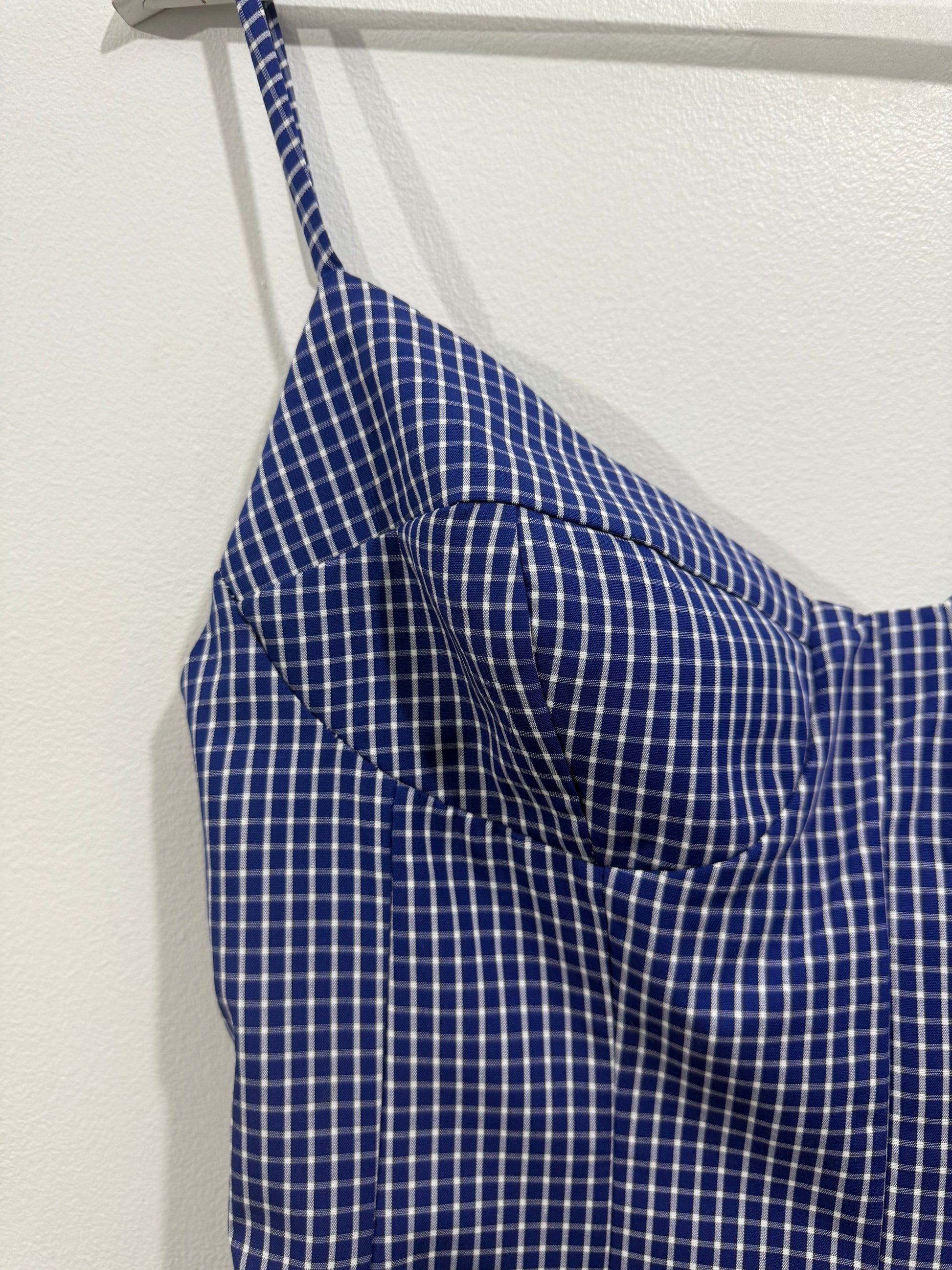 Vestido de cuadrito en azul marino y blanco. Es de tirantes con escote de corazón y cazuelas sin relleno. Tiene pinzas y evase. Queda entallado de cintura y sienta ideal.