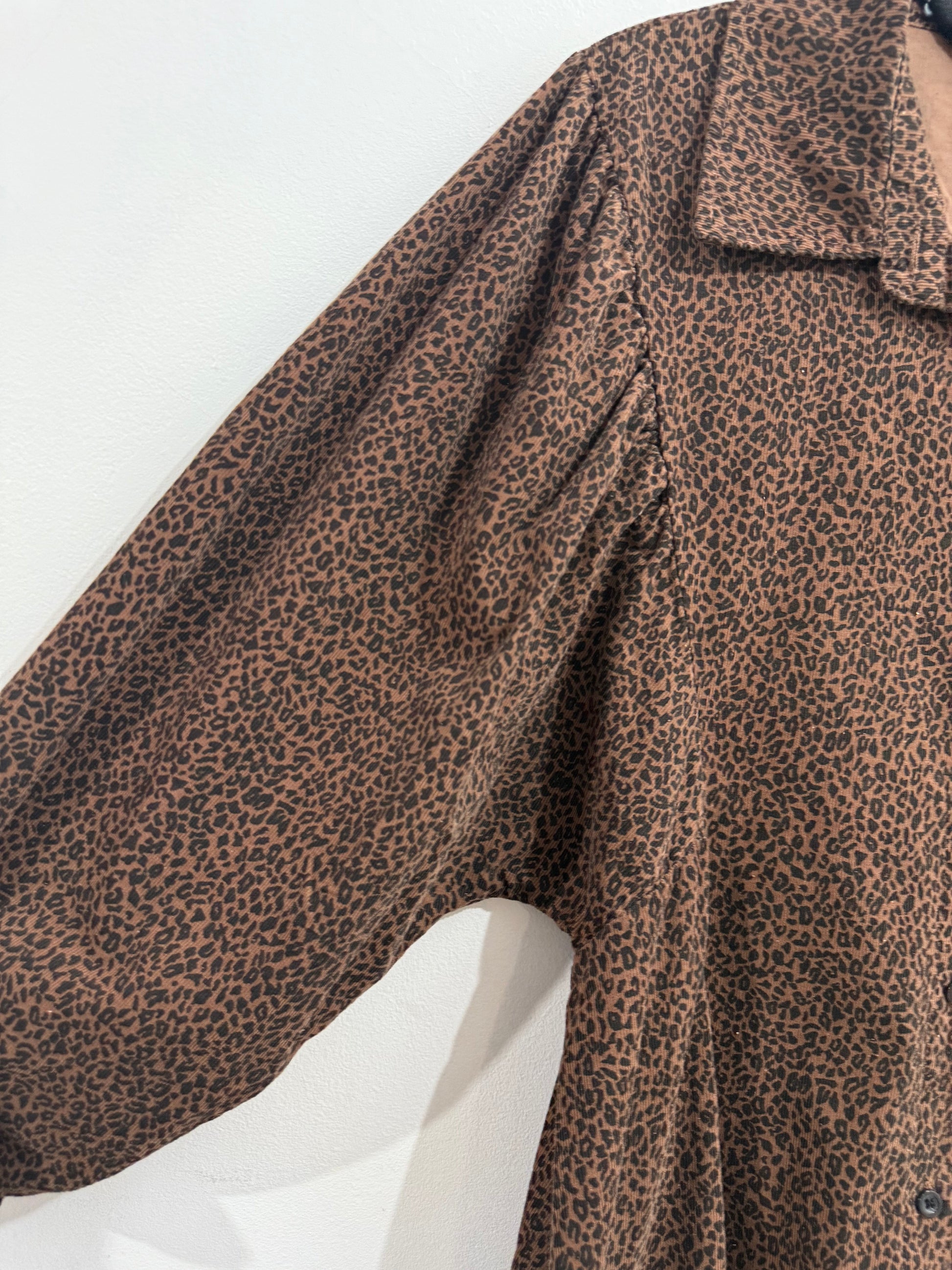 Vestido camisero de micro pana con estampado animal print en tonos marrones. Abotonado en parte delantera, cuello con solapas y manga abullonada.