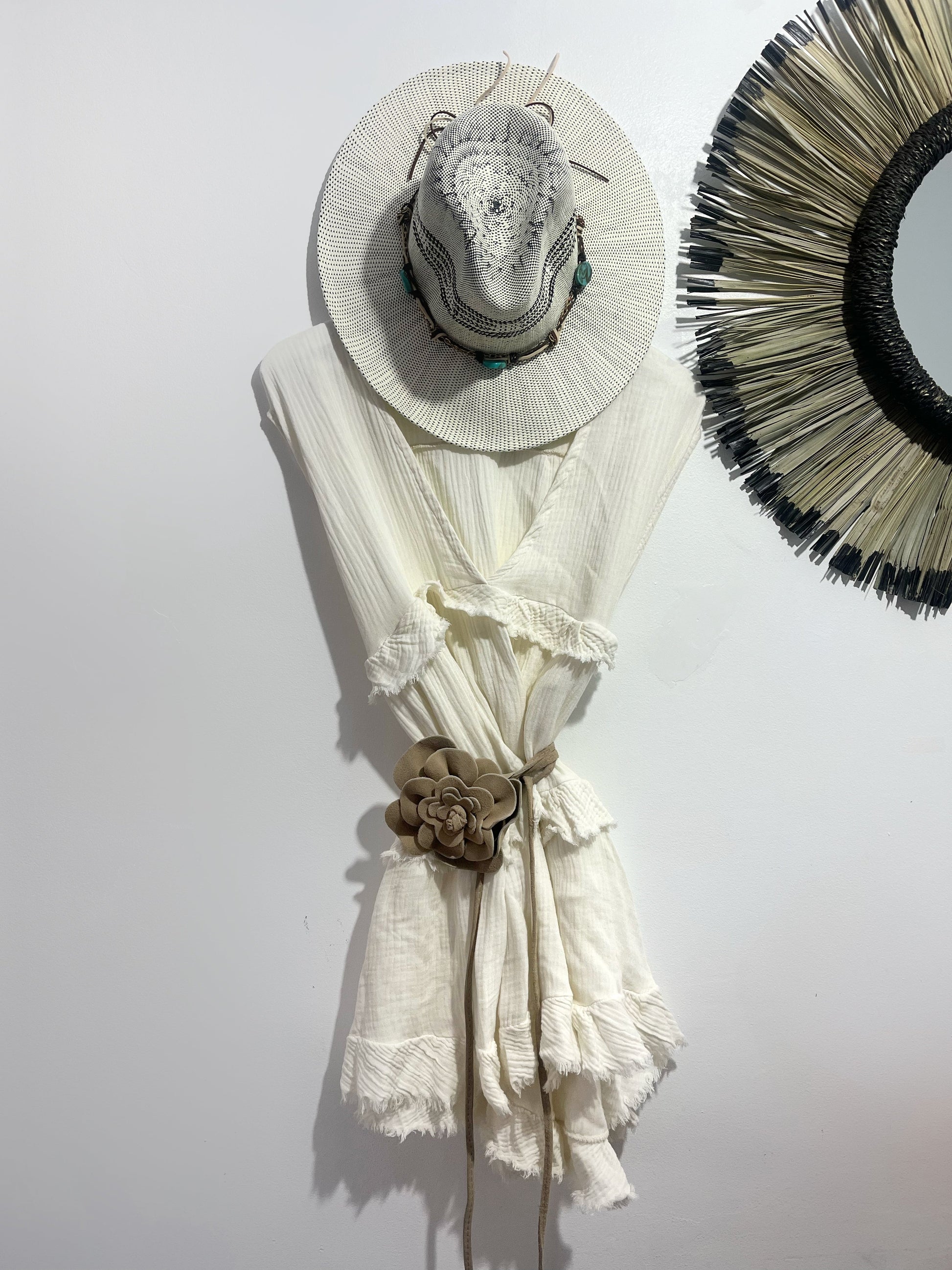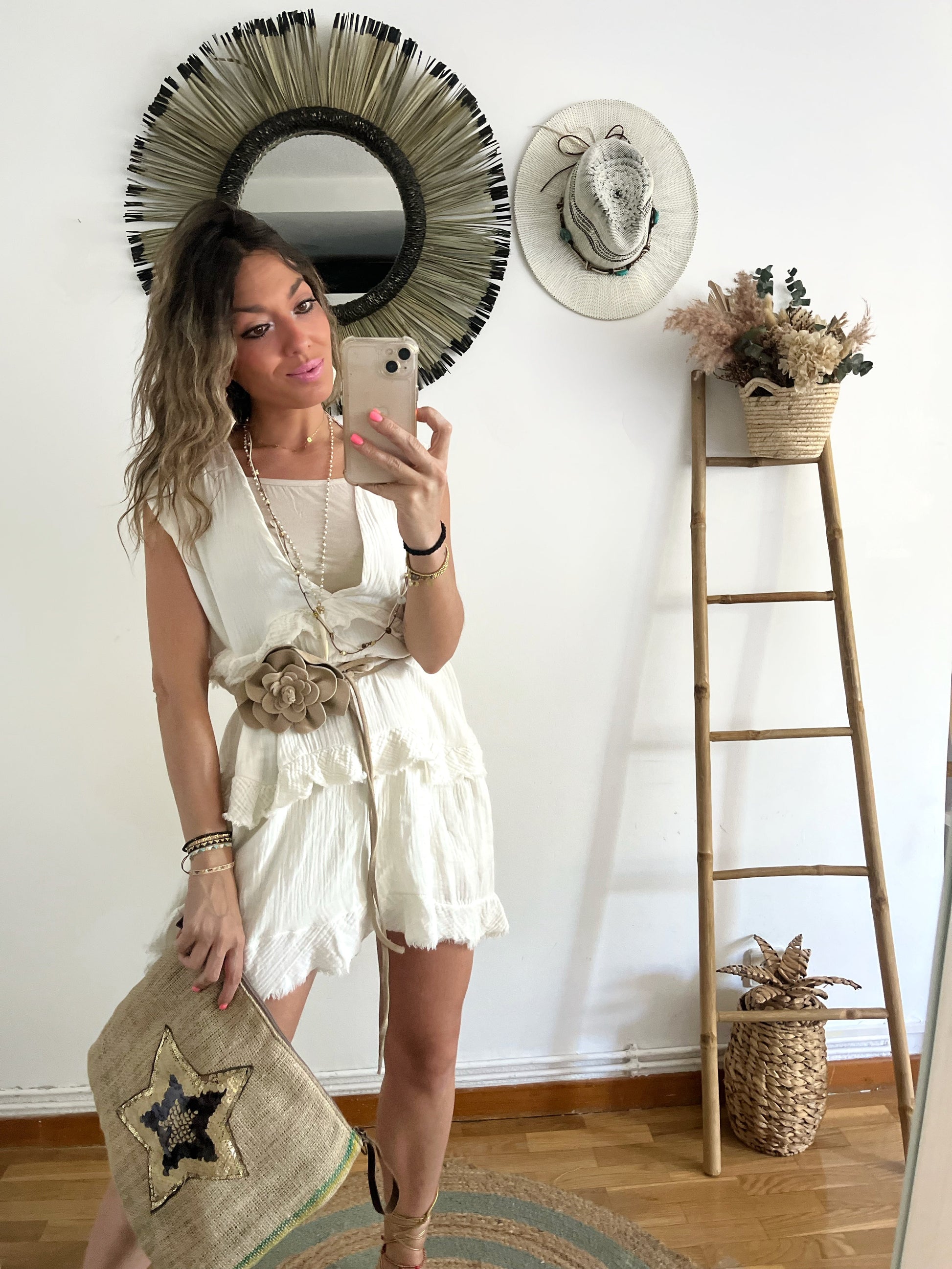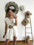 Vestido de algodón en color blanco roto. Tiene escote a poco, no tiene mangas y tiene cortes desflecados. Lleva vestido lencero interior con lo cual no transparenta nada. Tiene bolsillos laterales.