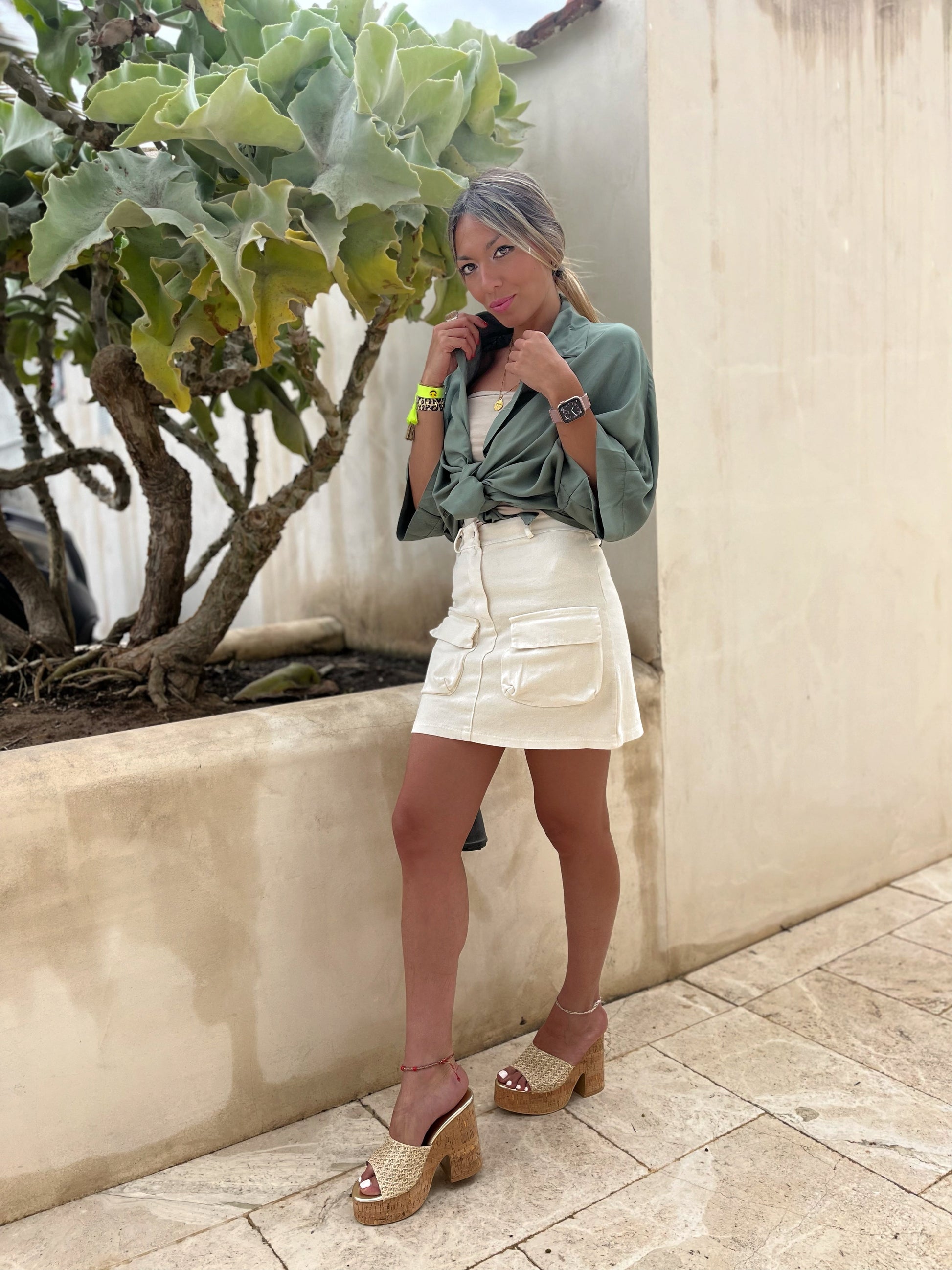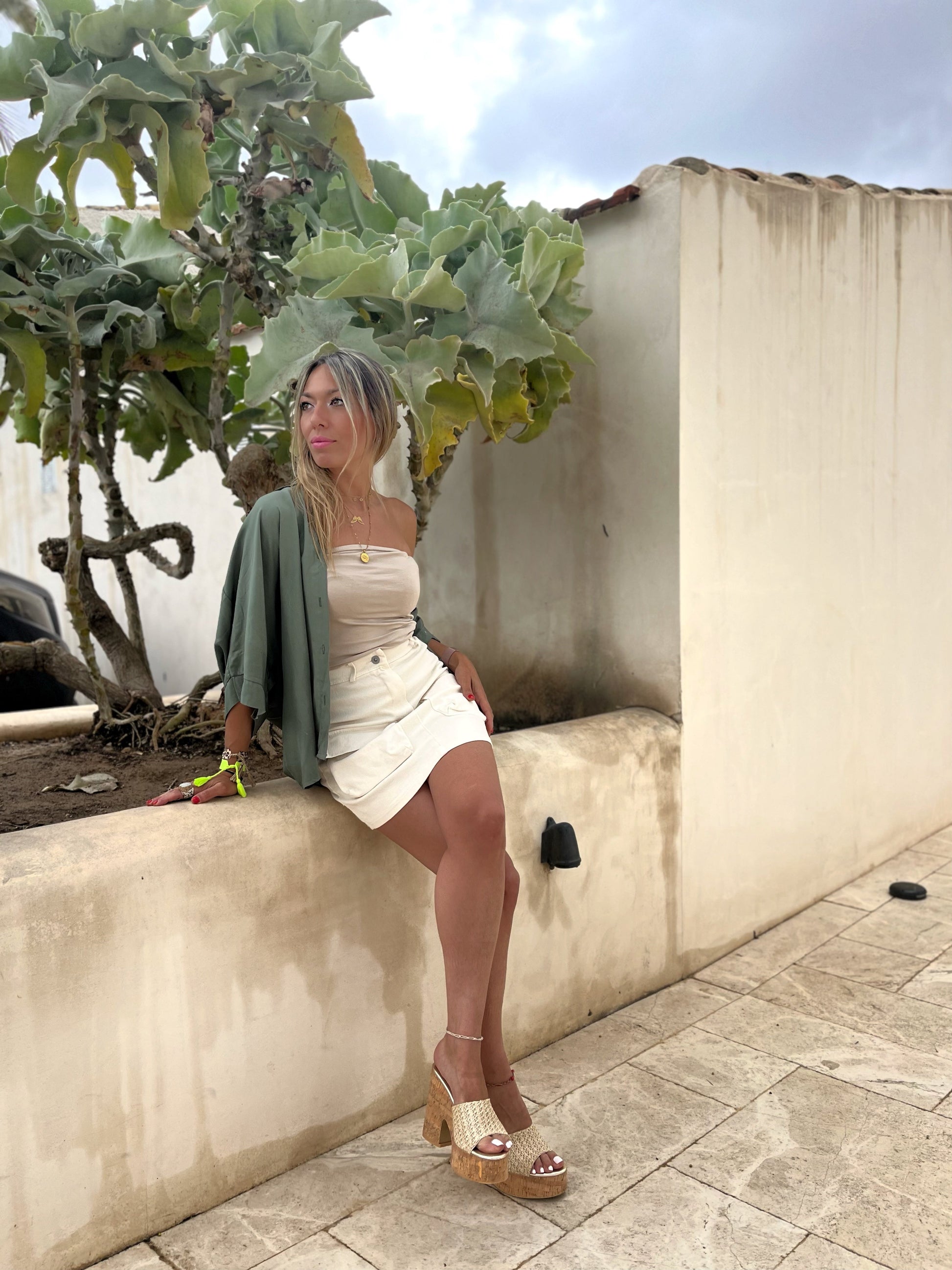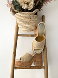 Zueco en color crudo con plataforma de corcho. No pesa nada y son híper cómodos. Se ajustan muy bien al pie. Plataforma delantera 3,5cm. Plataforma trasera 12cm